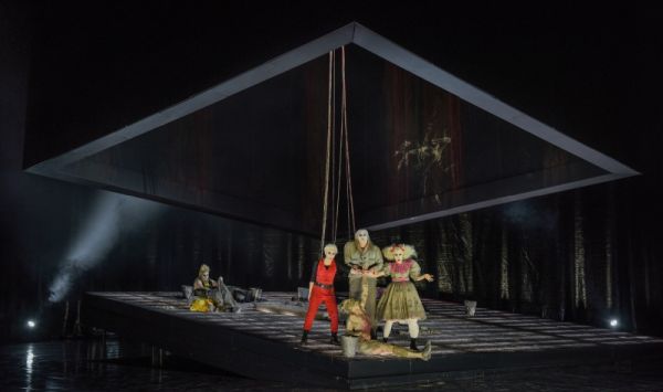 Nach der sauber, einfühlsam und mit besonders weicher Eindrücklichkeit einiger (harmonischer) Wandlungen gespielten Ouverture steigt aus der Bühne ein (öfter schon in anderen Inszenierungen gesehenen) rechteckig etwas querständiges großes Podium herauf, das von unten mit Neon beleuchtbar ist und von oben eine Art Dach erhält. Auf dieser „Gefängnis“ bezeichneten Schräge befindet sich allerhand Gerümpel, hauptsächlich Eimer, und im fahlen Licht wird der Gefangene Florestan, der Schauspieler Michael Rensburg, erkennbar, der sich in dieser Phase von oben bis unten, auch Haare und Gesicht, mit Dreck oder Gips eingeschmiert hat, und sich am ganzen Körper rauft. Er wirkt dabei wie der Insasse eines Irrenhauses. Dazu gesellen sich gleich zwei Gestalten wie aus der Commedia dell’arte entsprungen, die Marzelline mit plüschigem Reifröckchen, einem dicken weißbestrumpften Bein und wirren grauen Lockenhaaren, der Jaquino wie Harlekin mit Pluderhosen, dicken Bauchringen und Goldwams und -haaren, auf tapsen auf dem Hubpodium herum. (Bühne: Claudia Rohner).