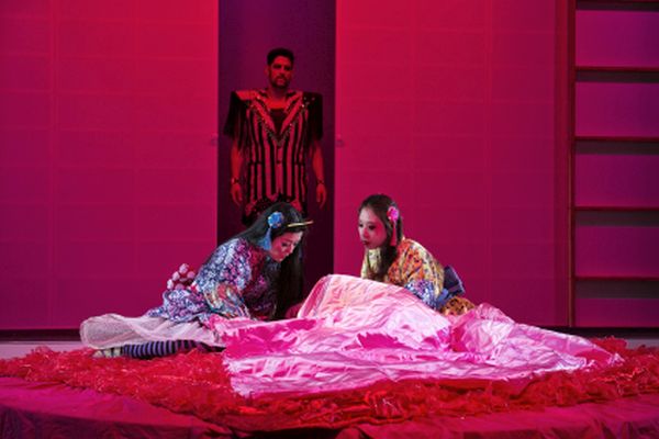 Ein Glücksfall ist auch die Sängerin der Titelpartie, SuJin Bae, in deren Repertoire sich auch die Königin der Nacht und die Violetta befinden. Ihr bereits recht metallisch klingender Sopran bewältigt die Partie auch darstellerisch erfreulich gut, nur in der Schlussszene wünschte man sich noch sottilere Töne. Einen markanten Väter-Bass konnte Elias Han für den in dieser Inszenierung in ein milderes Licht getauchten Blinden einsetzen. Ebenfalls sonor und dabei angenehm geschmeidig klang der Bariton von Till Bleckwedel, der in abenteuerlicher Gewandung den bösen Bordellbeseitzer Kyoto sang. Sogar Domingo hatte seine Probleme mit der schwierigen Partie des Osaka, insbesondere mit der Serenade. Gustavo Eda hat beachtliches Material, das aber noch recht ungefüge und mit besonderer Vorsicht in der Höhe eingesetzt wird. Da er zur Zeit noch studiert, kann sich das noch zum Positiven wenden. Mit angenehmen lyrischen Stimmen gefielen Seri Baek und Yuri Mizobuch i in den kleineren Rollen.