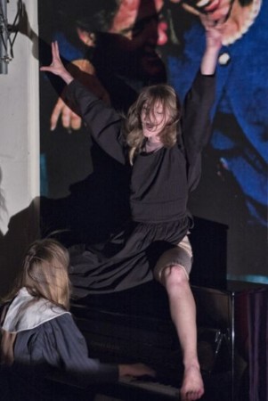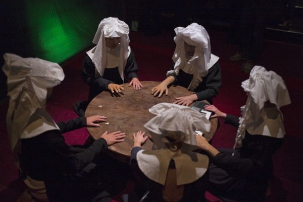 Es fängt eigentlich ganz annehmbar an mit um einen Tisch (mit dem wird später eine Schwangere erschlagen) versammelten Wesen, die die Hexen darstellen sollen, allerding mit Hauben und von vorn wie Nonen gekleidet sind, während ihre Kittel nach Art der in Krankenhäusern benutzten hinten den Blick auf die Unterwäsche (weiß, im Verlauf der Handlung mit immer mehr roten Flecken) freilässt (Christina Kämper). Grauslich gut ist auch der Einfall, eine dieser Hexen die Nachricht Macbeth‘ an die Lady dieser vor die Füße spucken zu lassen oder mit einem rituellen Tanz mit Riesenschwert den zweiten Teil einleiten zu lassen. Auch das Einschläfern des Macbeth durch die von den Hexen herbei gerufenen Geister kann überzeugen. Dazwischen gibt es aber immer wieder und immer zu lange Passagen wie das Telefongespräch einer Ukrainerin mit der bejahrten Verwandtschaft in der Heimat, das dem „Patria oppressa“ vorangeht. Das mag eine Herzensangelegenheit einer der Verantwortlichen gewesen sein, aber solche sollte man nicht einem Publikum aufzwingen. Auch „Bruder Jakob“ oder das Filmen einzelner Situationen (ein alter Regiehut) stören eher als dass sie erhellen. Man hat immer wieder den Eindruck, das Stück solle mit Gewalt in eine Länge gezerrt werden, die es ursprünglich hat, obwohl nur ein verhältnismäßig geringer Teil der Originalmusik erklingt.