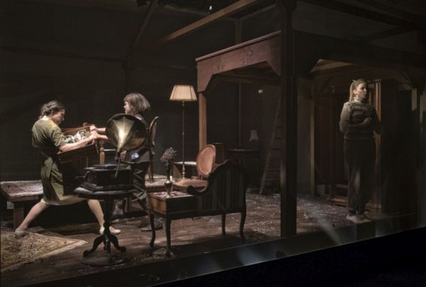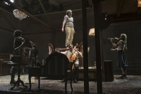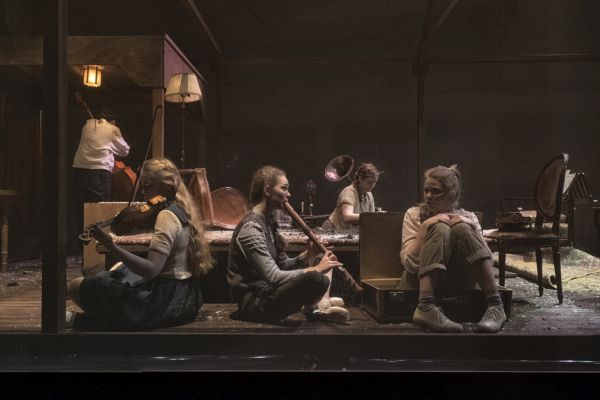 Auf den Ankündigungen der Produktion sind noch Mädchen in einem Wald zu sehen, so dass man Ähnliches wie im Film erwarten kann. Das nach beiden Seiten hin offene Bühnenbild (Rebekka Dornhege-Reyes) zeigt hingegen drei nebeneinander liegende Behausungen: ein gutbürgerliches Wohnzimmer mit Kronleuchter und Klavier, ein bescheidener eingerichtetes Zimmer und einen Hängeboden, der als Schlafstätte dienen wird. Man reimt sich zusammen, dass die sieben Schwestern, von denen im Programmheft berichtet wird, Krieg und Flucht überlebt haben, an sicherem Ort versammelt sind und mit Hilfe der Hausmusik schlimmes Erlebtes, von denen sie in Sprechtexten berichten, zu bewältigen versuchen. Dabei ist die Oper „Hänsel und Gretel“ wohl mit besonders schönen Erinnerungen verbunden und hilft ihnen, den Verlust der Eltern, der Heimat, vielleicht auch der Identität zu verkraften.