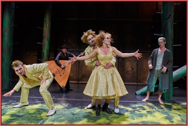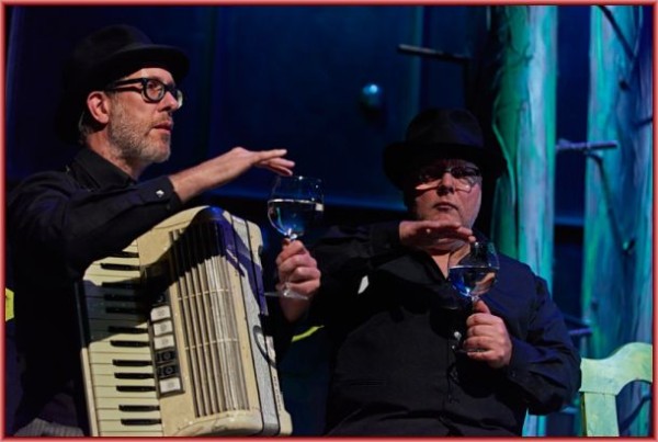 Einen wesentlichen Teil dieses Gesamtkunstwerkes macht allerdings, nicht nur die Sprache aus, sondern die Vielfältigkeit in der Musik, besser der musikalischen Begleitung und Untermalung. Man vermisst keine Band, denn was die beiden Multigenies Christoph Kammer und Henning Nierstenhöfer (Bild oben) hier leisten, ist so begnadet wie vielfältig ausziseliert. Ihre Bearbeitung diverser Musikinstrumente, denen sie liebevoll köstliche Töne, Klänge, Rhythmen und Harmonien entlocken, ist phänomenal ohne je aufdringlich zu wirken. Auch sind sie so leichtfüßig ins Bühnenbild und die Handlung integriert, daß sie manchmal fast wie Requisiten wirken. Sie machen gelegentlich sogar Stille hörbar…