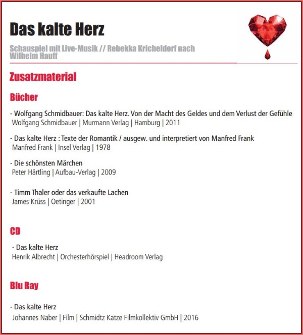 "Das Kalte Herz" ist kein Märchen für Kinder, oder doch? Zumindest kann man die wunderbare Vorlage von Rebekka Kricheldorf (2002 Autorenpreis der deutschsprachigen Theaterverlage und Publikumspreis beim Heidelberger Stückemarkt, 2003 Kleist-Förderpreis, 2010 Kasseler Literaturpreis) auch im Genre "Jugendtheater" einordnen. Sie macht aus einem Kunstmärchen von 1827 auf höchst spannende und unterhaltsame Weise ein Theaterstück von heute, welches so berührt, weil alles immer noch gesellschaftlich aktuell ist. Brandaktuell!