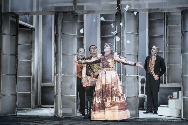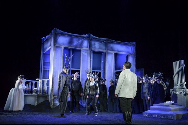 Lothar Krause und Ausstatter Pascal Seibicke stellen eine Art Endzeit-Bühnenbild auf die Drehbühne, zum einen das Grabmal des Monarchen, zum anderen ein angedeuteten Innen-/Außenraum von recht angegangener Zeitsymbolik. Leider steht gerade letzteres oft im Wege und verbirgt einem, nicht gerade kleinem Teil der Zuschauer, die Sicht auf die Solisten, was äußerst ungeschickt wirkt. Die Personenregie als solche zeigt sich tauglich mit Mängeln , so werden singende Protagonisten abgewendet gestellt, oder in Ensembles akustisch ins "Off" plaziert, wie zum Beispiel Amelia in der Lose-Szene. Die Chorregie fällt nicht so geschickt aus, Chorauftritt in der Galgenszene oder gar die ganze Finalszene des Maskenballes, der wichtig wie namensgebend ist. Ohne Tanz wirkt das einfach nicht und der dargestellte Albtraum Adolf Friedrichs überzeugt mich nicht.