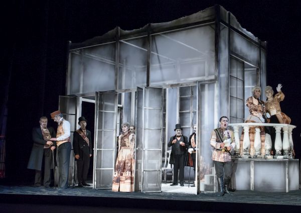 Einen sehr ortsgebundenen "Maskenball" gibt es derzeit am Theater Neubrandenburg/ Neustrelitz zu erleben, denn Regisseur Lothar Krause hat auf die übliche Handlung der Verdi-Oper eine andere, historische Schablone gesetzt: der Schwedenkönig Gustav wird zu Großherzog Adolf Friedrich VI. von Mecklenburg-Strelitz(1882-1918), der wahrscheinlich mit einem Suizid in Neustrelitz seinem Leben ein Ende setzte. Hier sei jedem Besucher der sehr interessante Einführungsvortrag empfohlen; ich selber werde die etwas verschlungene Aufschlüsselung nicht näher erläutern, doch funktioniert das Überstülpen dieser Folie im Wesentlichen recht gut. Das Ehepaar Renato/Amelia wird zum historischen Fürstenpaar von Pless, desweiteren treten noch andere Personen der Geschichte ohne gesangliche Solorollen auf, die aus den Choristen heraus sehr kompetent besetzt sind. Die Grundidee finde ich sehr faszinierend und gelungen, doch in der szenischen Umsetzung finde ich handwerkliche Mängel.