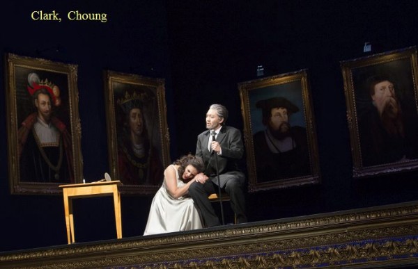 Das im Prinzip einheitliche Bühnenbild (auch von Stefan Rieckhoff) ist gleichermaßen opulent und zweckmäßig. Im späteren Verlauf wird um das gesamte Bühnenbild als weitere Metapher für den „musealen“ Bilderbogen ein riesiger Bilderrahmen gespannt. Wenn die Verschwörer das Schloss in Brand setzen, sollte der eigentlich lichterloh brennen, was aber technisch nicht ganz geklappt hat.