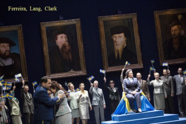 Sängerisch hat der Chor fast den Löwenanteil zu bestreiten, den er in der Einstudierung von Thomas Böhnisch in hervorragender Form bewältigt. Miriam Clark ist, trotz kleiner Intonationstrübungen, eine hervorragende Besetzung für die Christine – ausdrucksvoll und mit Belcanto-Glanz. Melanie Lang ist mit sicherem Mezzo eine attraktive Maria. Als Axel Oxenstierna gibt Ill-Hoon Choung eine Vaterfigur von fast schon Verdischer Prägung. Paulo Ferreira bietet für den Gabriele tenorales Feuer, viel Leidenschaft und eine sichere, etwas kehliger Höhe. Eindrucksvoll kann Daniel Moon in seiner gesanglich sehr dankbaren Rolle als persönlichkeitsstarker Karl Gustav überzeugen. Seine Arie hat großes stimmliches Format. In weiteren Rollen bieten Alexander Murashov als Erik, Tomasz Wija und Philipp Kapeller als Verschwörer sowie Anna Aviakan als Voce interna eine gute Ensembleleistung.