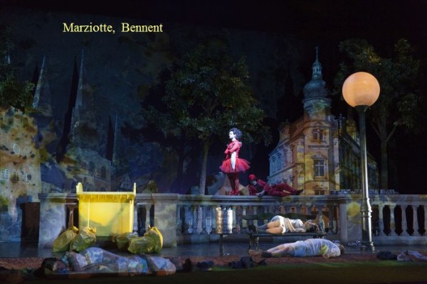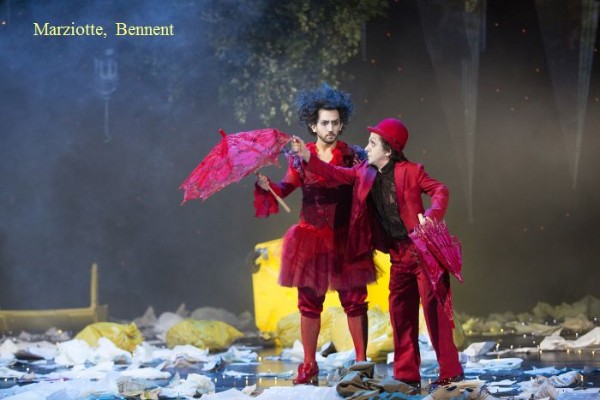Rysers Inszenierung bewegte sich dabei in ruhigen Bahnen und erzählte die Ereignisse dieser Sommernacht in einer unspektakulären, sehr märchenhaften Art und Weise, ohne die sexuellen Abenteuer drastisch vorzuführen. Weiter als bis zur Unterwäsche ging es nicht. So blieb auch dank der phantasievoll ausgestatteten Bühne der poetische Zauber des Elfenreichs gewahrt. Hatten Ryser und Rieckhoff bei ihrem „Falstaff“ vor zwei Jahren auf die Farbe Grün gesetzt, so war es diesmal Rot. Oberon und Titania erschienen in knallroten, sehr hübschen Kostümen, ebenso Puck mit einem drolligen Bowler-Hütchen. Auch die Beleuchtung des Zuschauerraums war rot. Die theaterbesessenen Handwerker rund um den später in einen Esel verwandelten Bottom (eigentlich besser bekannt als Zettel), waren hier zu Müllwerkern mutiert, die den Dreck auf Oldenburgs Strassen in Säcke stopfen.