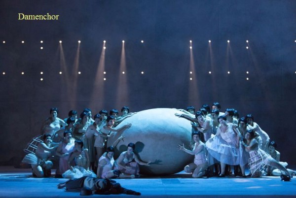 Aber für das Dämonische sind die Hexen ohnehin zuständig. Warum man sie in so hässliche Unterkleider gestopft hat (Kostüme Claudio Pohle), bleibt allerdings ein Rätsel. Sie sind jedenfalls allgegenwärtig, ob als Hofdamen oder Flüchtlinge Sie sind es auch, die beim Bankett unter der gedeckten Tafel lauern und Macbeth die Geistererscheinung Banquos vorgaukeln. Anfangs hüten sie ein riesiges Ei, das Symbol der Fruchtbarkeit. Eine Miniaturausgabe wird am Ende an Malcolm überreicht, der die Königsdynastie fortsetzen wird. Es sind viele faszinierende Bilder und Gedanken, die Nadja Loschky in ihre Inszenierung eingebracht hat: Bei den Teilen der Ballettmusik, die hier gespielt wurden, wird die Schreckensherrschaft von Macbeth und seiner Lady verdeutlicht. Immer wenn sie mit einem riesigen Zepter auf den Boden stampfen, sinkt jemand tot zu Boden. Die Ermordung Banquos wird von einer mit Totenköpfen maskierten Beerdigungsgesellschaft angedeutet. Und die Schlafwandelszene der Lady wird hier zu einem Spiel mit Stoffpuppen.