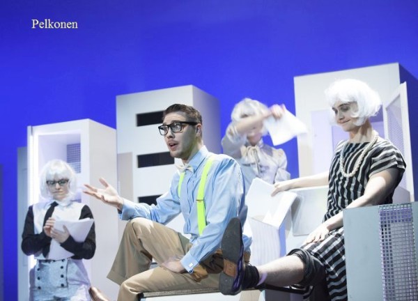 Bernsteins durchweg schmissige Musik wird von sechs Musikern unter der Leitung von Carlos Vázquez gespielt. Sie hat vorwiegend Musical- oder Jazz-Charakter. Vieles von seiner späteren „West Side Story“ klingt hier schon an. Wenn sich Dinah und Sam jeder für sich nach einem stillen Ort sehnen, wohin sie die Liebe führt, dann erinnert das an „Somewhere“. Und auch die Mambo-Rhythmen von Anita finden sich schon in „Trouble in Tahiti“. Neben den beiden Protagonisten Nina Bernsteiner, die hier als Dinah zu einer Art Doris Day erblondet ist und gekonnt in eine ganz andere Rolle schlüpft, und dem Bariton Aarne Pelkonen als Sam gibt es noch ein Figurentrio (Carolina Walker, Maciej Michael Bittner und Kim-David Hammann – alles Studierende der Hochschule Osnabrück), das eine ähnliche Funktion hat wie der Chor in der antiken Tragödie und munter kommentierend über die Bühne wuselt. Aber zur Tragödie kommt es bei Bernstein nicht. Es scheint so, dass Dinah und Sam ein kleines Stückchen von dem Inselzauber aus dem „Tahiti“-Film in ihren Alltag gerettet haben. Das Ende bleibt offen.
