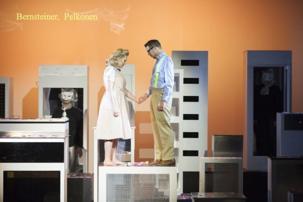 Dort sieht sie den schrecklich kitschigen Film „Trouble in Tahiti“ (der der Oper den Titel gab) als Talmiersatz für echte Gefühle. Wissert leuchtet die Bühne dazu in orangefarbigem Licht aus und lässt Flitter vom Himmel regnen. Es ist ein unwirklicher „Inselzauber“ der hier beschworen wird und nichts mit dem realen Leben zu tun hat. Die Farbe, die sich hier im Bühnenbild von Thurid Peine und in den Kostümen von Viola Weltgen zeigt, ist im Alltag ihrer Ehe nicht mehr zu finden. Auf der Bühne stehen weiße Kästen und Türme in verschiedenen Formen und Größen. Sie haben doppelte Funktionen. In Dinahs Welt sind es Kühlschränke oder Waschmaschinen als Symbol für gehobenen Lebensstil, für Sam können es auch Wolkenkratzer für seine Businesswelt oder einfach Podeste für seine vielen Sportpokale sein, die überall herumstehen.