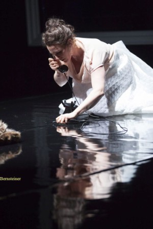 Auf der ins Halbdunkel getauchten Bühne sitzt im Hintergrund Carlos Vázquez am Klavier, vorne agiert Nina Bernsteiner als die junge Frau. Sie drückt ihre seelische Höllenfahrt stimmlich bis in die feinsten Nuancen aus, mal weich und zärtlich flehend, mal aggressiv auftrumpfend, mal in tonlosem Sprechgesang, mal mit ariosen Aufschwüngen. Dazu kommt eine körperliche Ausdrucksvielfalt, die vom Wutausbruch bis zur physischen und psychischen Erschöpfung reicht. Regisseurin Julia Wissert hält den Spannungsbogen von Anfang bis Ende ungebrochen durch. Wenn die Frau ihr verzweifeltes „Ich liebe dich“ in den Hörer schleudert, zieht sie den Telefonstecker – danach gibt es nichts mehr zu sagen, das soll das letzte Wort gewesen sein. Anschließend erdrosselt sie sich mit der Telefonschnur. Aber das ist nur noch ihre Privatsache, die Verbindung ist da schon längst gekappt.