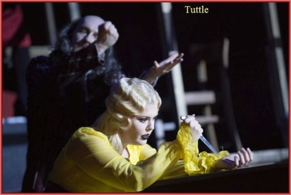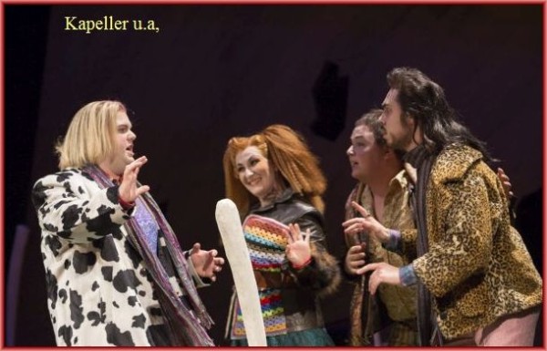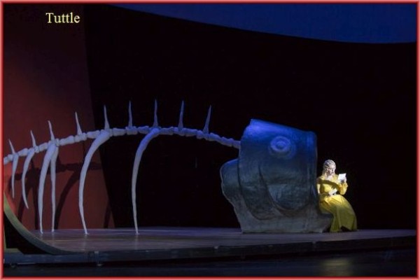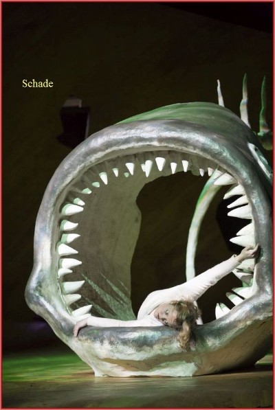 Das phantasievolle Bühnenbild von Anne Neuser (sie sorgte auch für die ausgefallenen Kostüme) spielt mittels Projektionen durchgehend mit dem Fischmotiv und wird im Schlussakt gekrönt von einem riesigen Fischskelett mit gefährlichen Reißzähnen. Der weiße Hai lässt grüßen.