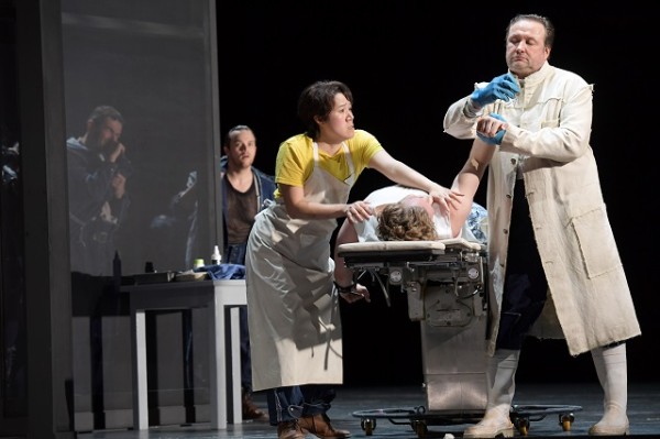 Schon wieder müssen wir das Adjektiv „surreal“ für eine Operninszenierung gebrauchen, denn was sich in den knapp 90 Minuten nun vor den Augen der Premierenbesucher ausbreitet, ist ein Horrortrip durch eine disparate Vorhölle, in die sich der verhaftete Journalist unvermittelt geworfen sieht. Statt der Auspeitschung zu Beginn zertrümmert man ihm mit einem Hammer die Knochen beider Hände. Zur Behandlung der Verletzungen wird er auf einer Pritsche festgebunden. Die Figur des Filka Mozorov interpretiert Regisseur Herrmann als Lagerarzt, der gefährlich mit einer Knochensäge herumhantiert, und von dem deswegen zunächst nicht klar ist, ob er den Neuankömmling foltern oder kurieren will. Nebenbei erzählt er die Geschichte des Mordes, dessentwegen er in das Lager gesteckt wurde. Vincent Wolfsteiner zeichnet diese Figur durch seinen schneidenden Charaktertenor mit latentem Hang zum hinterhältigen Wahnsinn.