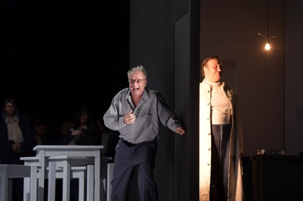 Die zweite Mordgeschichte erzählt AJ Glueckert als Skuratov mit gut fokussiertem Tenor, dem er den Ton verzweifelter Leidenschaft abzugewinnen weiß. Er hatte den Zwangsverlobten seiner großen Liebe Luisa erschossen. Schon sieht man in einem der vorüberziehenden Raumfragmente den Erschossenen tot über einem Eßtisch hängen, während ein emsiger Beamter im Schutzanzug die Spuren des Tatorts sichert. Im Mittelteil der Oper hat Janáček zwei kurze Theaterspiele platziert, welche die Häftlinge zur eigenen Belustigung aufführen. In der Frankfurter Neuproduktion geraten sie zu Demonstrationen sinnloser Grausamkeit eines bösartigen Mobs an einem Außenseiter. Szenisch profilieren kann sich hier besonders Brandon Cedel, der als namenloser Sträfling 1 zwar wenig zu singen hat, dafür aber mit beeindruckender Bühnenpräsenz den Handlungsverlauf des zweiten Hauptteils entscheidend prägt. Geradezu beängstigend ist die Überzeugungskraft, mit der er einen hinterhältig-sadistischen Drahtzieher spielen kann.