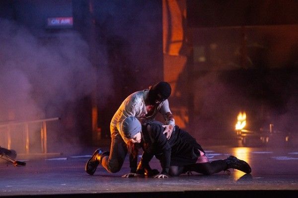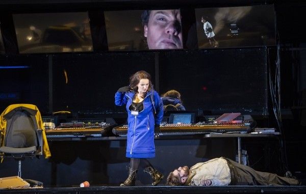 Izabela Matuła (Milada; in blauem Mantel), Thomas Faulkner (Beneš; auf dem Boden liegend) und Aleš Briscein (Dalibor; auf den Bildschirmen)