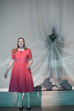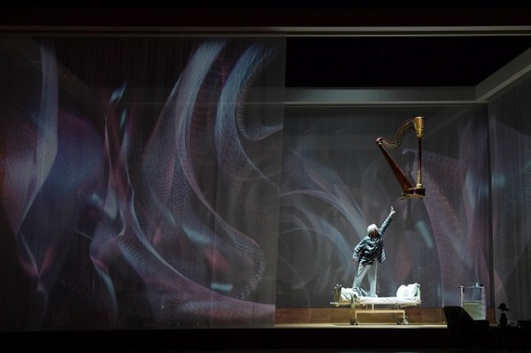 Das für die Szene verantwortliche Produktionsteam um Regisseur Damiano Michieletto hat die kluge Entscheidung getroffen, den musikalischen Farbenrausch optisch nicht zu verdoppeln. Das Bühnenbild (Paolo Fantin) ist schlicht, von transparenten weißen Schleiern gesäumt, die mal als Projektionsflächen dienen, mal reale oder surreale Hintergrundszenen durchscheinen lassen. Schon hierin findet die Flüchtigkeit von Klang eine visuelle Umsetzung. Verstärkt wird dies durch Projektionen abstrakter Gebilde, wie sie in Lehrfilmen zur Darstellung von Schallwellen gebraucht werden. Der See in der Waldszene wird durch sich ausbreitende konzentrische Kreise dargestellt. Zu diesem eher dekorativ-abstrakten Symbolismus kommen noch immer wieder von der Decke herabgelassene Musikinstrumente. Der Himmel hängt hier weniger voller sprichwörtlicher Geigen als voller Harfen.