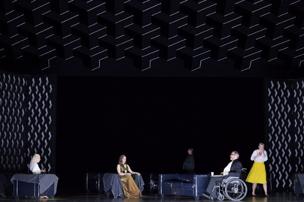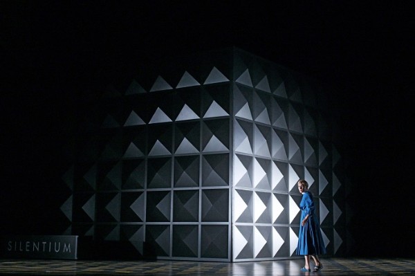 Die Inszenierung ist typisch für Claus Guth, sieht aber auf den ersten Blick gar nicht wie eine Guth-Inszenierung aus. Das liegt vor allem daran, daß das Bühnenbild dieses Mal nicht wie in den zahlreichen vorangegangenen Guth-Arbeiten für Frankfurt (angefangen beim Maskenball über Trittico, Daphne, Pelléas, Rosenkavalier, Rodelinda bis zur Lustigen Witwe) von Christian Schmidt gestaltet wurde, sondern von Martina Segna. Auffälligster Unterschied: die Schmidt-typische Treppe fehlt. Und es fehlen die hohen, hellen Räume. Stattdessen wird die Bühne in den Schlüsselszenen von einem dunklen Kubus bestimmt, dessen Formelemente immer wieder variiert werden. Wo Schmidts Räume historisch verortbar sind, setzt Segna auf zeitlose Abstraktion.