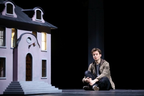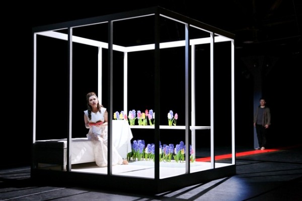 Sehr verrätselt gibt sich dieses Spätwerk von August Strindberg. Ein wenig Geistergeschichte, ein wenig Gesellschaftssatire, viel dunkler Symbolismus, keine klaren Deutungsebenen. Regisseur Walter Sutcliffe versucht sich in der aktuellen Inszenierung im Bockenheimer Depot daher vernünftiger Weise an keiner Deutung und beschränkt sich darauf, das verwickelte Geschehen klar und flüssig auf der Bühne zu präsentieren. Dazu hat Kaspar Glarner ihm eine schlichte Rampe gebaut. Zwei Zuschauertribünen erheben sich zu beiden Seiten. Auf der ansonsten leeren Rampe bewegt sich im ersten Bild das mannshohe Modell des mysteriösen Hauses, tanzt regelrecht über die Bühne, dreht sich, präsentiert sich, lockt. Im Zwischenspiel zum zweiten Bild teilt das Modell sich in zwei Teile, die sich zur jeweiligen Seite von der Rampe entfernen. Die Statue einer jungen Frau fährt aus dem Bühnenboden empor. Es ist ein Bildnis der Mumie in jungen Jahren. Zum Souper fahren Sessel, ein Sofa und ein Tisch wie von Geisterhand herbei, drehen sich tänzeln, umrunden die Bühne, bilden ein Karussell, auf das die Protagonisten aufsteigen, bis die Endposition der Möbel für das Ritual erreicht ist. Das ist raffiniert ausgedacht und technisch perfekt umgesetzt. Das dritte Bild schließlich präsentiert das Hyazinthenzimmer als kubisches Gerüst, das ebenfalls auf der Rampe frei beweglich ist und zum Ende in immer schnelleren Drehungen um die eigene Achse seinen Charakter als Käfig offenbart. Zum Sterben des Fräuleins breitet sich eine Blutlache aus, die beide Darsteller besudelt. Ob das Fräulein blutet oder das Zimmer, wird nicht klar, und diese Uneindeutigkeit ist wohl auch beabsichtigt.
