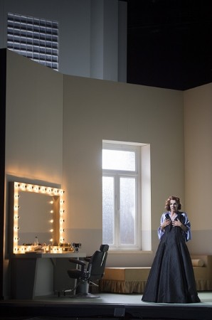 Bei näherem Hinsehen erweist sich Guths „Witwe“ aber als Verwandte der „Ariadne auf Naxos“. Hier wie da wird das Porträt einer verlassenen Frau präsentiert. Die „wüste Insel“ der Ariadne ist für die Darstellerin der „Witwe“ die Garderobe, in der ein aufdringlich lärmendes Metronom ihre trostlose Einsamkeit vermißt. Wie bei Hoffmannsthal-Strauss in einem Vorspiel als Rahmen für die eigentliche Oper die Protagonisten als Darsteller und kapriziöse Opernsänger präsentiert werden und diese erste Ebene schließlich mit der zweiten Ebene der Opernaufführung verschmilzt, so daß am Ende nicht einmal mehr die Darsteller wissen, ob die Stimmungen und Gefühle ihrer Figuren nicht doch ihre eigenen sind, so hat sich Guth ein Filmset für den Dreh der Operette ausgedacht, bei dem die Schauspieler mit den von ihnen dargestellten Figuren verschwimmen. Den gesamten ersten Akt bis zur Pause läßt sich Guth damit Zeit, diese Idee auszubreiten. Er verweigert zunächst die Ouvertüre, sondern zeigt Marlis Petersen in der Titelrolle, wie sie in ihrer Garderobe gelangweilt Einsingübungen vollführt. Man erfährt, daß die Sängerin mit dem männlichen Hauptdarsteller Iurii Samoilov eine vergangene Beziehung verbindet, der die Petersen noch immer nachtrauert, während Samoilov die Erinnerung mit Alkohol und leichten Mädchen zu vertreiben sucht. Die beiden sprechen sich immer wieder als „Marlis“ und „Iurii“ an, um dann unvermittelt zu „Hanna Glawari“ und „Graf Danilo Danilowitsch“ zu werden. Dabei werden dann wie nebenbei die ersten Operettenschlager abgearbeitet, so daß etwa das berühmte „Heut geh‘ ich ins Maxim“ in der Künstlergarderobe erklingt. Man wechselt von Garderobe zu Filmkulisse, chargiert in die Filmkameras hinein, tritt dann wieder aus den Kulissen heraus und mimt den Mimen. So entsteht ein zunächst etwas anstrengendes Stop-and-Go. Kaum ist mal eine Operettennummer in Gang geraten, unterbricht ein Regisseur-Darsteller („Studiolicht!“) und reißt den Zuschauer aus der schwelgenden Gemütlichkeit. Das zieht sich mitunter. Die Kritik daran hat Claus Guth gleich mitinszeniert, indem er den Regisseur-Darsteller (großartig mit blasiertem Wiener Akzent: