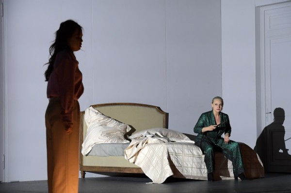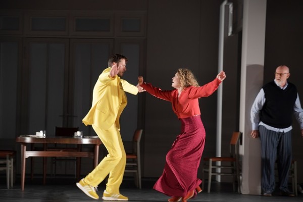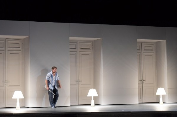 Nun sieht das Publikum in der aktuellen Neuproduktion von Mozarts letzter Oper, wenn der Vorhang sich nach der dankenswerterweise unbebilderten Ouvertüre hebt, ein Bühnenbild (Andrew Lieberman), wie es sich in ungezählten Loy- und Guth-Produktionen als idealer Hintergrund für ausgefeilte Personenregie erwiesen hat: Weiße, schmucklose Wände, viele Türen, zurückhaltende, edle klassizistische Möblierung. Auch ein Flügel darf in diesem gutbürgerlichen Haushalt nicht fehlen. Auf der Drehbühne sind unterschiedliche Räume angeordnet, durch welche Tamino bis zur ersten Pause wie benommen in Pyjamahose und dicken Socken schlafwandlergleich herumschlurft. Natürlich wird er zu Beginn von keiner Schlange verfolgt und folglich auch nicht von den drei Damen errettet. Diese sind als Party-Girls mit Champagnerflaschen ausgestattet und necken beschwippst den verschlurften Prinzen und den inzwischen hinzugetretenen, in einen zitronengelben Dreiteiler gewandeten Papageno.