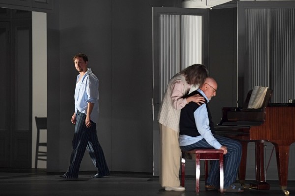 Erst im zweiten Teil nach der Pause wird die übergeordnete Idee der Inszenierung, die das wie immer instruktive Begleitheft entwickelt, auch auf der Bühne deutlicher: Als weitere, stumme Gestalt taucht ein Greis auf, eine gealterte Version von Tamino, wie seine Kleidung verrät. Er ist offensichtlich dement, bewegt sich mühsam, halt- und orientierungslos durch das Haus, umsorgt von einer gleichalten Gefährtin, bei der die Kleidung nicht verrät, ob es sich um die gealterte Version der Pamina handelt. In dem geistigen Nebel seiner Demenz erscheinen die Musiknummern der Zauberflöte wie Fetzen der Erinnerung, letzte Anker aus einer Vergangenheit vor der Erkrankung. Auf dem Flügel liegt, wie sich am Schluß zeigt, eine Partitur der Zauberflöte. Der junge Tamino schlägt hier einmal traumverloren einige Tasten an, der alte Tamino kramt zu der Verzweiflungsarie Papagenos mit ihren Selbstmordgedanken die Töne der Panflöte hervor und probiert sie am Flügel aus. Dies ist einer der wenigen Momente, in denen sich der behauptete Überbau mit den Vorgaben des Stückes musikalisch verbindet. Schon kurz zuvor, bei der Feuer- und Wasserprobe hatte sich sogar szenisch eine stille und berührende Umdeutung des Textes ereignet. Wenn Tamino und Pamina im Duett Feuer und Wasser durchschreiten und hier erst durch gemeinsam bewältigte Not und Gefahr zum Paar werden („Wir wandeln durch des Tones Macht, froh durch des Todes düstre Nacht! Wir wandelten durch Feuergluten, bekämpften mutig die Gefahr“), sitzt das gealterte Paar am Flügel und schaut in die Partitur der Zauberflöte. Sie blickt in sanfter Melancholie zurück auf die gemeinsame Vergangenheit, in ihm blitzen Erinnerungen wieder auf. Sie haben ihren Frieden gemacht mit dem nahenden Ende, dem allmählichen Verdämmern, getröstet durch ihre Verbindung, dankbar für das gemeinsam Erlebte. Derart aus dem Märchenkontext herausgenommen zeigt sich eine unerwartete Parallele zum letzten von Richard Strauss‘ „Vier letzten Liedern“, wo es im Text von Eichendorff heißt: „Wir sind durch Not und Freude gegangen Hand in Hand: Vom Wandern ruhen wir beide nun überm stillen Land. … Zwei Lerchen nur noch steigen nachträumend in den Duft. Tritt her und laß sie schwirren, bald ist es Schlafenszeit, daß wir uns nicht verirren in dieser Einsamkeit. O weiter, stiller Friede! So tief im Abendrot, wie sind wir wandermüde – Ist dies etwa der Tod?“