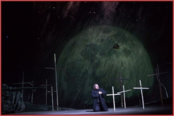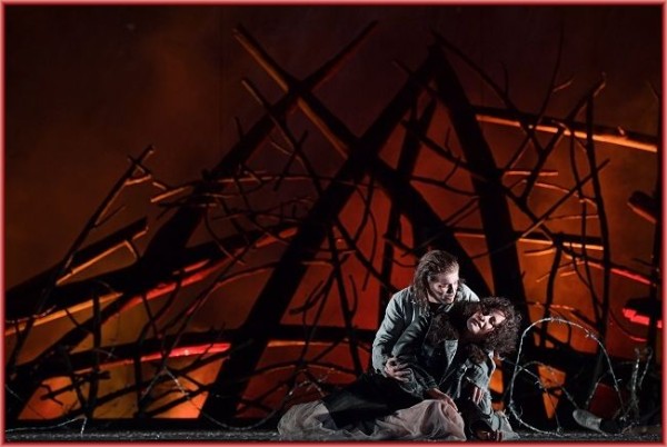 Zur Musik: „Eine Aufführung des Troubadour ist einfach: Man braucht einfach nur die vier besten Sänger der Welt.“ Dieses Caruso-Zitat ist so abgedroschen wie es nichtssagend ist. Man hätte auf Jahre hin finanziell ausgesorgt, wenn man für jede Verwendung in einer Troubadour-Kritik 100 Euro ausgezahlt bekäme. Sicher, die Partien sind anspruchsvoll, aber das sind sie in anderen Opern auch. Die aktuelle Frankfurter Besetzung kommt problemlos mit den hohen technischen Anforderungen zurecht. An erster Stelle ist hier Brian Mulligan in seinem Rollendebüt als „Conte di Luna“ zu nennen, dessen samtiger, wohltönender, gut fokussierter Bariton auch in den vielen hohen Passagen ungetrübten Genuß bereitet. Elza van den Heever hat ihre üppige Stimme gut im Griff, kann sie immer wieder zu schwebenden Piani zurücknehmen und bleibt den Koloraturen nichts schuldig. Mit Piero Pretti hat die Oper Frankfurt einen international an allen wichtigen Häusern beschäftigten Spinto-Tenor für die Rolle des „Manrico“ engagiert, dessen helles, recht kopfiges Timbre Geschmackssache ist. Aber seine Stimme ist jederzeit durchsetzungsfähig und harmoniert in Duetten und Ensembles gut mit den übrigen Sängern. Singt er das hohe C? Ja, und er hält es auch lange genug, um mit dem erwartbaren Szenenapplaus bedacht zu werden.