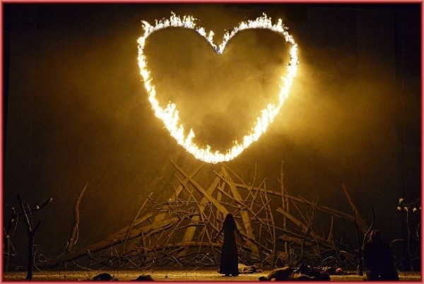 Daß das Ganze vom beginnenden 15. Jahrhundert in eine vage angedeutete Gegenwart verlegt wurde, bringt zwar keine besonderen Einsichten mit sich, stört aber auch nicht. Die wenigen sonstigen Bühnenelemente, etwa Andeutungen von dürren Bäumen mit weißen Papierblüten, lassen die Szenen oft wie dreidimensionale Zeichnungen wirken. Verstärkt wird das im ersten Teil durch zurückhaltend eingesetzte Videoeinblendungen, die als behutsame Bebilderung der Musiknummern durchaus einigen Zauber entfalten. Die Zigeuner werden im Kontrast zur ansonsten vorherrschenden Düsternis mit kräftig-bunten Kostümen als Gauklertruppe gezeigt. Der Wechsel der Szenen wirkt durchaus kurzweilig, und so vergeht die Zeit bis zur Pause wie im Fluge. Im zweiten Teil jedoch geht dem Bühnenbildner die Puste aus. Außer, daß sich zum Ende hin ein riesiger, glühend rot angeleuchteter Scheiterhaufen drohend erhebt, zwischendurch ein Panzer hereingerollt wird und es beständig schneit, trägt die Ausstattung nichts mehr zur Belebung der Szene bei, bis schließlich am Schluß ein überdimensionales Stacheldrahtherz fotogen und ein wenig kitschig abgefackelt wird. Das legt die handwerklichen Schwächen des Regisseurs bloß, die mit den Videobildchen im ersten Teil noch gut kaschiert werden konnten. Bösch weiß mit seinen Figuren einfach nichts anzufangen. Interaktionen wirken schematisch, wenn sie denn überhaupt stattfinden und die Sänger nicht einfach irgendwie im Raum herumstehen. Daß die kurzfristige Einspringerin in der Rolle der zentralen Figur der Zigeunerin Azucena sich offensichtlich mühelos in die Produktion einfügen konnte, spricht weniger für ihre mimische Begabung als für die Anspruchslosigkeit der Regie. Immerhin die Chorszenen werden mit einigen Gags aufgemöbelt, die aber beliebig wirken. Ob Verdis Meistermachwerk mehr als eine Nummernfolge von Bravourstücken sein könnte, kann man in dieser Inszenierung noch nicht einmal erahnen.