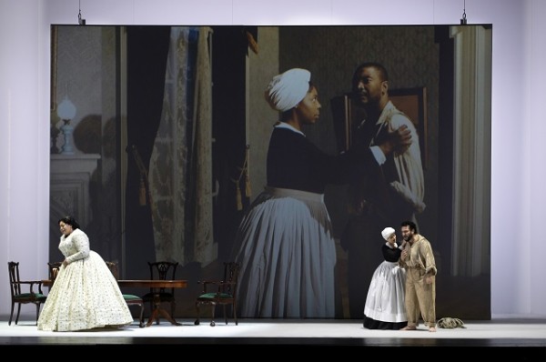 Es beginnt, recht vielversprechend, im 19. Jahrhundert in einem Landhaus, offenbar in den Südstaaten. Es treten auf: ein farbiges Zimmermädchen, ein weißer Gutsherr, seine weiße Tochter und ihr farbiger Liebhaber. Der so ausgestellte Rassenkonflikt ist für ein heutiges Publikum verständlicher als der Rassismus gegenüber dem Halbindianer aus dem Libretto. Warum ist das so? Weil eben auch und gerade die Europäer, die Nachkriegsdeutschen zumal, in ihrem ikonographischen Repertoire von nichts anderem so sehr geprägt sind wie von amerikanischen Filmen. Also bietet die erste Szene eine Reminiszenz an Vom Winde verweht. Die Vorgegebenheit der Premierenbesetzung, daß der Darsteller des Farbigen von weißer Hautfarbe ist, die Darstellerin seiner weißen Geliebten jedoch eine Afroamerikanerin, hat den Regisseur zu dem Einfall gebracht, auf den Rückprospekt einen Film zu projizieren, in dem das Bühnengeschehen noch einmal stumm mit der umgekehrten Hautfarbenzuordnung abläuft. Auch wenn Bühnenaktion und Filmhandlung nicht völlig synchron verlaufen, was auch albern gewesen wäre, finden doch die markanten Ereignisse im vorproduzierten Film wundersamer Weise punktgenau zur Musik statt. Und weil die Filmschauspieler wesentlich lebendiger und glaubwürdiger agieren als das Bühnenpersonal, konzentriert man sich ganz auf das Filmgeschehen. Auf diese Weise wird kaschiert, daß dem Regisseur in punkto Personenregie bei den Sängern außer Allerweltsgesten nichts eingefallen ist.