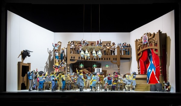 Nach einer kurzen Umbaupause findet man sich in einem Westernsaloon wieder, in dem nun die Wirtshausszene spielt. Die Protagonisten tragen Schwellköpfe. Die Einrichtung ist bewußt vergröbert und hat die Anmutung von zu groß geratenem Kinderspielzeug. Aha, denkt man sich, da hat jemand seinen Ulrich Schreiber (Die Kunst der Oper) gelesen, von wegen Verdis „Kasperle- und Welttheater“. Das geht ebenfalls in Ordnung. Die nachfolgende Szene vor dem Kloster springt dann unversehens ins 20. Jahrhundert. Die Klosterbrüder sind biedere evangelikale Langeweiler mit Hemd und Pullunder. Man ahnt bei der Textzeile „die Brüder sollen sich mit brennenden Kerzen am Altar versammeln“, wohin das führen wird und tatsächlich: die Biedermännern ziehen sich weiße Kapuzen über und fackeln ein Kreuz ab. Willkommen beim Ku Klux Klan. Mit diesen Eindrücken geht man in die Pause.