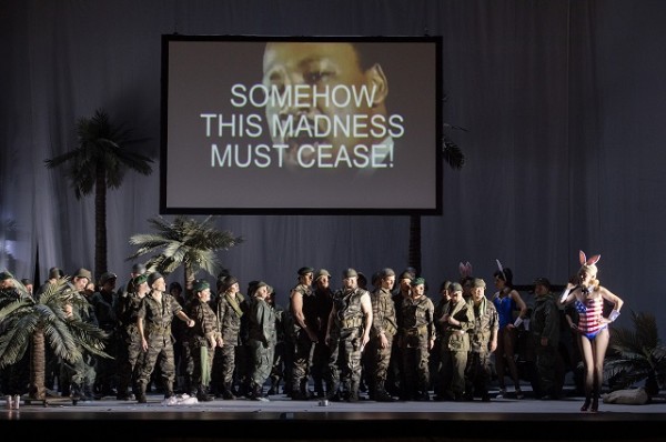 Das alles ist durchaus unterhaltsam, aber mitunter auch ziemlich platt. Im Programmheft und im Video-Trailer zur Produktion gibt der Regisseur Auskunft über seine Absichten. Er verkauft sich und seine Ideen sehr gut. Daß ihm keine zwingende szenische Umsetzung aus einem Guß gelungen ist, daß seine bunten Bilder episodisch bleiben und allzu offensichtlich auf äußere Reize setzen, hält er für werkimmanent: disparate Vorlage, disparate Umsetzung. Kratzer macht es sich damit ein wenig zu leicht. Müssen sich die Defizite des Librettos denn unbedingt auch in der Regie widerspiegeln? Will man das am Ende als höhere Form der Werktreue ausgeben? All die bunten Bilder und die klugen Assoziationen können über eines nicht hinwegtäuschen: Kratzer kümmert sich zu wenig um seine Figuren. Individuelle Psychologie? Plausibilisierung der Motivation der Handelnden? Fehlanzeige. Lediglich in den Rahmenszenen, zu Beginn und zum Schluß also, gelingt es dem Regieteam in Ansätzen, das übergeordnete Thema auf die individuellen Schicksale der Protagonisten herunterzubrechen, bezeichnender Weise aber mehr in den vorproduzierten Einspielfilmen als in der Bühnenhandlung. Ansonsten hat man je länger der Abend dauert umso mehr den Eindruck, daß hier mit einer allzu cleveren Regie ein krudes Libretto auf das Prokrustesbett eines wohlfeilen politischen Überbaus gespannt wird. Vielleicht geht mehr auch nicht. Vielleicht aber wäre weniger sogar mehr gewesen.