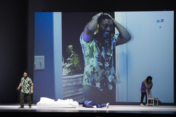 Was folgt daraus für den Gang der Handlung? Nichts, denn man muß ja weiter zur nächsten Szene mit der Armenspeisung. Sie findet vor schmucklosen weißen Wänden statt. Eine lebensgroße Statue von Barack und Michelle Obama markiert die Ankunft im 21. Jahrhundert. Wo ist der Bezug zum Rassismus? Der kommt erst wieder in der Schlußszene. Wieder wird sie von einem Film auf dem Rückprospekt gedoppelt. Wieder treten die Darsteller aus der Vom-Winde-verweht-Szene des Beginns auf. Dieses Mal ist der Schauplatz ein Hotelzimmer. Hier spielt sich die tödliche finale Konfrontation von Alvaro und Carlo ab. Zwei weiße Polizisten erscheinen und erschießen Carlo. Die Kamera zoomt auf den Fernseher im Hotelzimmer. Zu sehen sind Bilder von einer Demonstration: „Black lives matter.“ Vorhang.