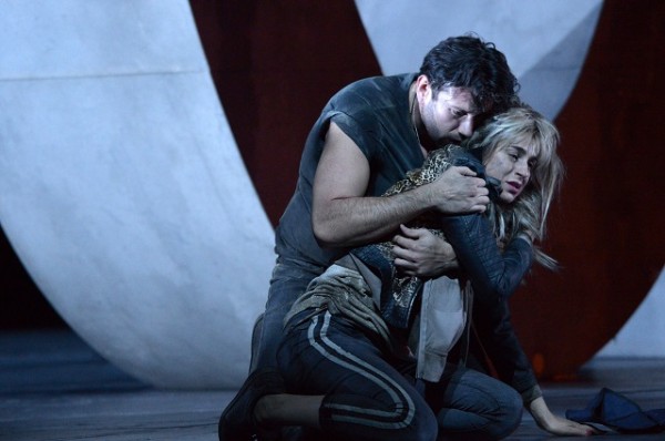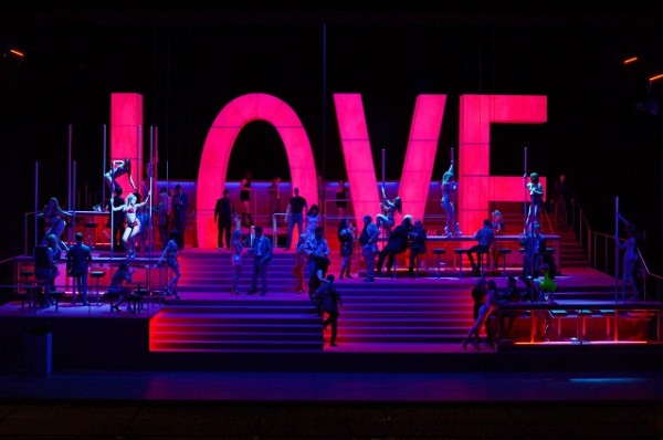 Am Ende gibt es einen einsamen Liebestod, den das Libretto in einer Wüste „nahe New Orleans“ verortet. Die aktuelle Frankfurter Produktion von Puccinis Manon Lescaut tut gut daran, diesen Ort so unbestimmt wie abstrakt zu zeichnen. Lediglich eine Skulptur ist auf der leeren Bühne zu sehen: Meterhohe, dreidimensionale Lettern in Waschbetonoptik zeigen das Wort „Love“, zunächst spiegelverkehrt, im Laufe dieses kurzen Schlußaktes durch langsame, kaum merkliche Drehung dann schließlich in richtiger Buchstabenreihenfolge. Die Skulptur wird von der Seite angeleuchtet und wirft seinen gewaltigen, kalten Schatten in eine öde Welt. Dieses Monument der Liebe war vom ersten Akt an präsent. Zunächst hielt es sich im Hintergrund und stützte das Vordach eines Hotels, dann bildete es rot angeleuchtet die Rückfront einer Tabledance-Bar, um dann schließlich freigelegt und isoliert die Trostlosigkeit des Endes zu durchmessen. Gegen diese erstarrte Ödnis glüht aus dem Orchestergraben das Orchester an, tremoliert, bäumt sich auf, während die Titelfigur auf der Bühne in den Armen ihres verzweifelten Geliebten an Erschöpfung stirbt.
