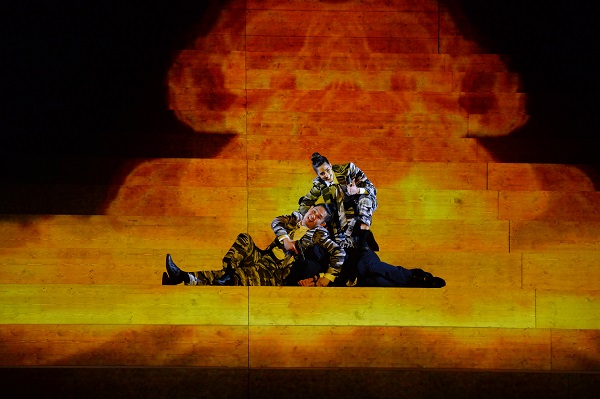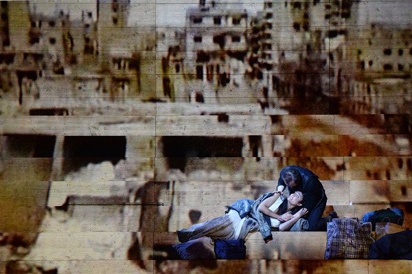 Die privaten Gelüste des Tyrannen bringen Tod und Verwüstung und machen seine Opfer zu heimatlosen Flüchtlingen. Aktuelle Bezüge zu den Bürgerkriegen im Nahen Osten drängen sich auf. So, wie schon im Libretto das Beziehungsgeflecht der Protagonisten vor dem Hintergrund kriegerischer Staatsaktionen ausgebreitet wird, wird die auf individuelle Charakterisierung abzielende Inszenierung von aktuellen Videobildern mit Truppenaufmärschen, zerbombten Städten und Flüchtlingslagern überblendet (Videos von Bibi Abel). Durch Projektion auf die Holztreppe wirken diese Bilder lamellenartig gebrochen und verfremdet. Sie bieten keinen platten Kulissenersatz, sondern dosiert eingesetzte Kommentare. An einer Stelle wird die Überblendung sogar als Mittel von Ironie eingesetzt. Im zweiten Teil verschwören sich Tigrane und Fraarte gegen den Tyrannen Tiridate und rüsten zu dessen blutigem Sturz. Da beide Rollen aber Sopranstimmen anvertraut sind, klingt das geradezu putzig. Diesen Kontrast von niedlicher Hülle und brutalem Inhalt nimmt die dazu verwendete Videoeinblendung auf, die einen Manga-Comic zeigt, in dem ein blutiges Gemetzel von den typischen kindlichen Figuren mit unschuldig-großen Kulleraugen angerichtet wird.
