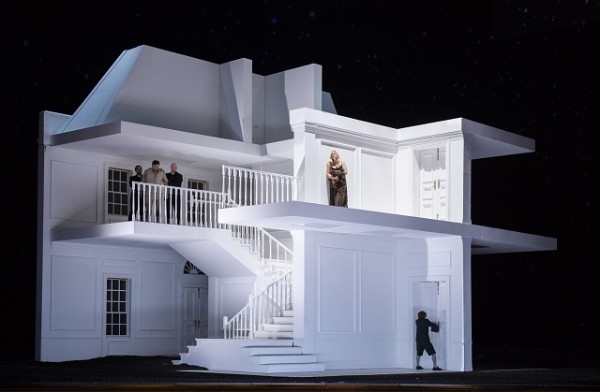 Daß zumindest die Außenfassade den „Georgianischen Baustil“ des 18. Jahrhunderts zitiert, erfährt man aus dem Programmheft. Einige Kritikerkollegen haben das naseweis abgeschrieben und ihren Lesern ohne Quellenangabe unter Vortäuschung eigener Kennerschaft präsentiert. Daß der Bühnenbildner sein Stilvorbild in einem Interview mit dem Frankfurter Hausdramaturgen überhaupt erwähnt, zeigt aber, wie genau und reflektiert er vorgeht. Es ist dabei gar nicht entscheidend, ob diese bauhistorische Einordnung erkennbar ist. Es teilt sich dem Opernbesucher nämlich stets unbewußt mit, wenn selbst in Details keine Willkür waltet.