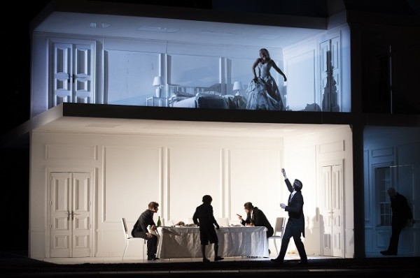 Die meisten großen Künstler haben einen unverwechselbaren Stil. Man hört wenige Takte und weiß: das ist Mozart, man sieht ein Porträt und weiß: das ist Picasso. Und wenn man es banal formulieren möchte, dann ist der Kern eines Stils die Wiederholung von Formen, Motiven und Techniken. So ist es auch möglich, daß andere „im Stile von“ komponieren oder malen. Die in einem bestimmten Stil gehaltenen Werke haben dadurch im Hinblick auf Grundparameter immer auch ein Moment von Vorhersagbarkeit. Wenn man nun also auf dem Besetzungszettel liest, daß zur von der Oper Frankfurt koproduzierten Rodelinda Claus Guth die Inszenierung besorgt und Christian Schmidt Bühnenbild samt Kostümen entworfen hat, dann lassen sich sichere Vorhersagen treffen: Im Bühnenbild wird eine Treppe einen zentralen Raum einnehmen, der Baustil wird klassizistisch anmuten, die beherrschenden Grundfarben werden weiß oder Pastelltöne sein. Außerdem wird es mit hoher Wahrscheinlichkeit mindestens eine stumme Rolle geben, die dem Geschehen ein zweite Erzählebene oder einen doppelten Boden verleiht. Womöglich werden auch einzelne Figuren vervielfacht werden. So ist es nun in der aktuellen Neuproduktion gekommen. Und trotzdem ist, was große Künstler eben auszeichnet, ein Unikat zu bestaunen. Die bewährten Stilelemente werden reflektiert und punktgenau dem neuen Stoff angepaßt, variiert, erweitert. Es gibt Wiedererkennungseffekte, aber auch Überraschungen. Tatsächlich ist nämlich die Anwendung des bewährten Handwerkszeugs keineswegs im Detail vorhersagbar.