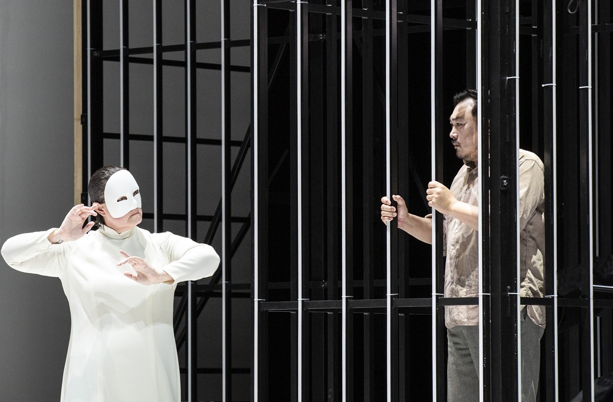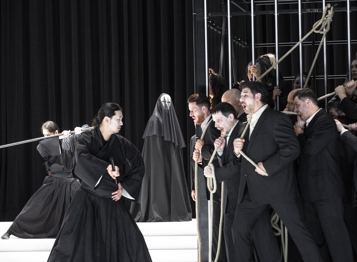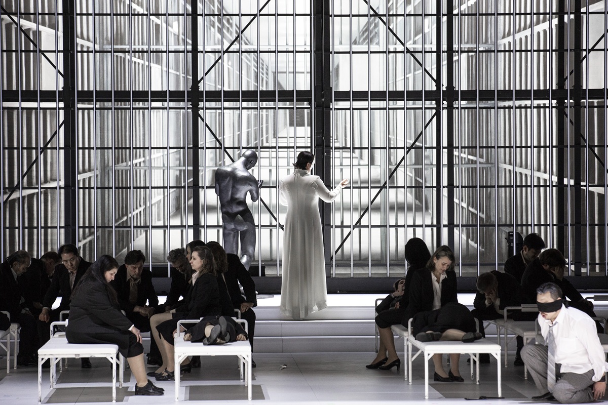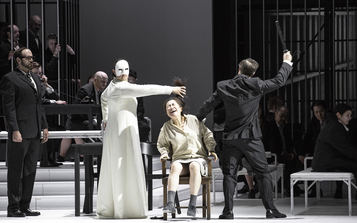 Es sind schwarz-weiße, gefängnisartige Räume mit Stahl-Käfigen, die Johannes Leiacker entworfen hat. Keine Farbe, kein stimmungsvolles Licht, auch die überwiegend schwarzen Einheitskostüme von Ursula Renzenbrink unterstreichen die Monotonie der Szene. Zu den Wenigen, die helle Kleidungsstücke tragen dürfen, gehören Liù und Calaf. Auch der Chor tritt in schwarzen Anzügen und schwarzen Kostümen auf. Einheitslook. Man denkt an die die Herrschaft Maos. Wie kommunistische Parteitage wirken denn auch die großen Chorszenen, sie werden statisch und ohne Bewegung arrangiert. Der „himmlische Kaiser“ ist gekleidet wie alle anderen: Auch er ist austauschbar. Die drei Minister werden als kafkaeske Schreibtischtäter in ebenfalls schwarzen Anzügen vorgeführt. Kurzum: Die Regie straft den Text des Librettos Lügen. Von tragischer Fallhöhe keine Spur. Nur Turandot darf ein schmuckloses, modernes weißes Kleid tragen, sie trägt zudem eine weiße Maske, ihr Gesicht sieht man nie, von Emotionen keine Spur. Turandot ist für Breth eine eiskalte Mörderin, sie wird als entmenschte Marionette vorgeführt, deren immergleiche Gesten und Gänge manieriert, ja gekünstelt und unnatürlich wirken (sollen). Nicht einmal, wenn Liù sich erdolcht, um nicht den Namen Calafs preiszugeben, und Turandot von der Macht der Liebe des jungen Mädchens überrascht wird, das für den Geliebten zu sterben bereit ist, zeigt Turandot ein Zeichen des Berührtseins. Nicht einmal kurz vor Ende der Oper, nimmt sie ihre Maske ab, nicht einmal da gibt sie sich als Frau zu erkennen. Stattdessen ersticht sie (sinnlos) einen ihrer Aufseher und geht gelassen dem Gefängnisgitter entgegen, emotionslos. Die Regisseurin bekennt denn auch, dass Turandot (zu der sie Kim Yo Yong, die grausame jüngste Schwester des nordkoreanischen Diktators Kim Jong Un, inspiriert habe) eine eiskalte, unveränderliche, terroristische Gewaltherrscherin, ja Mörderin ist. Das ist denn auch der schwerste Vorwurf an die Regie, dass (abgesehen von Liù und Calaf) kaum Menschen aus Fleisch und Blut gezeigt werden, nur Typen. Alle Psychologie, um die Puccini so bemüht war, wird ausgeblendet. Aber was ist denn das „in questa regia“ Turandots anderes als ein psychologisches Bekenntnis, ebenso wie das „signore ascolta“ Liùs. Doch Breth geht es nur um ihr Konzepttheater einer „Banalität des Bösen“. Sie will Turandot nicht verstehen. Daher zeigt sie die Titelfigur ohne menschliche Individualität. Andrea Breths Inszenierung ist weitgehend steril, plakativ, oratorienhaft und – mit Verlaub gesagt – langweilig. Die Monotonie des Szenischen ermüdet, trotz eingefügter Elemente des japanischen – und daher in China eigentlich fehlplatzierten – Nō-Theaters. Etwas Kolorit oder Exotik, von der die Musik ja voll ist, hätte der Aufführung gewiss nicht geschadet. Es muss ja nicht zwangsläufig in Kitsch ausarten. Und wie faszinierend, vital und mitreißend eine gänzlich antichinesische, reinweiße Inszenierung des Stücks sein kann, hat zuletzt Stefano Poda in Parma gezeigt. Andrea Breths Lesart ist – mit einem Wort – trostlos.