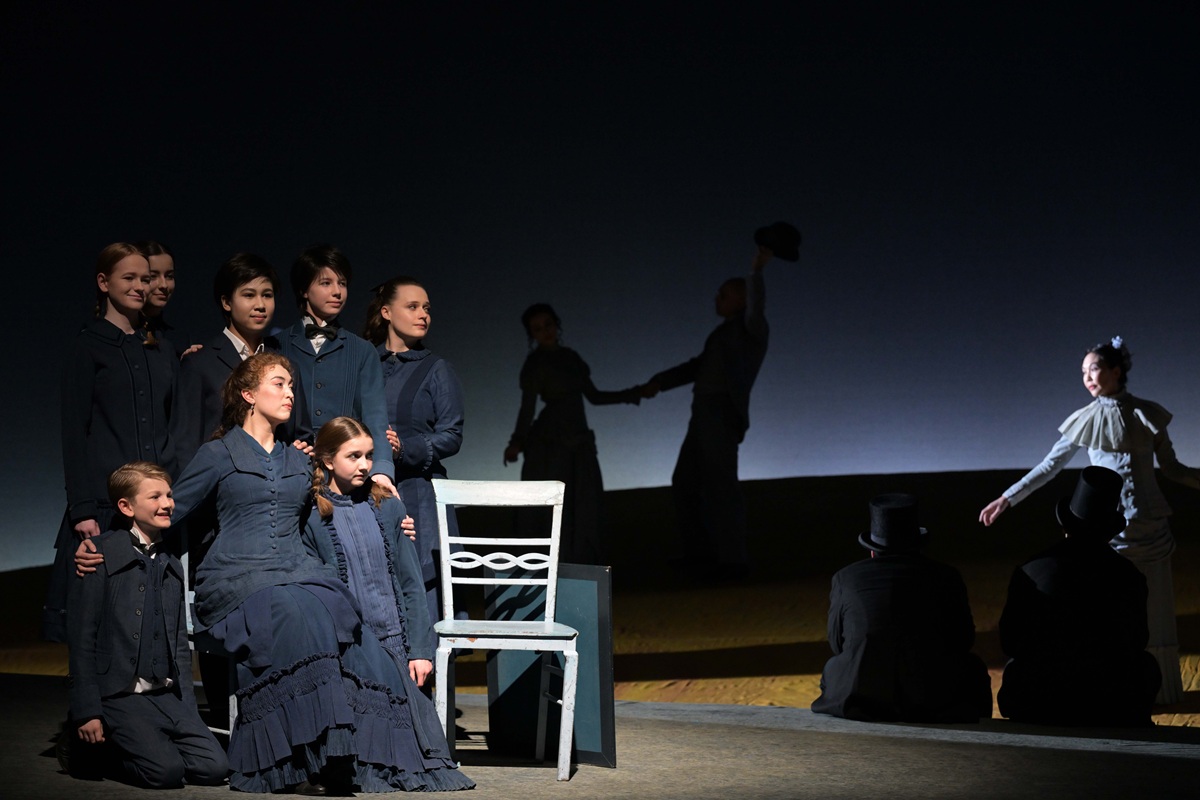 Bianca Andrew (Charlotte; sitzend) und Anna Nekhames (Sophie; rechts stehend, mit der Hand auf dem Arm des Jungen) sowie Ensemble