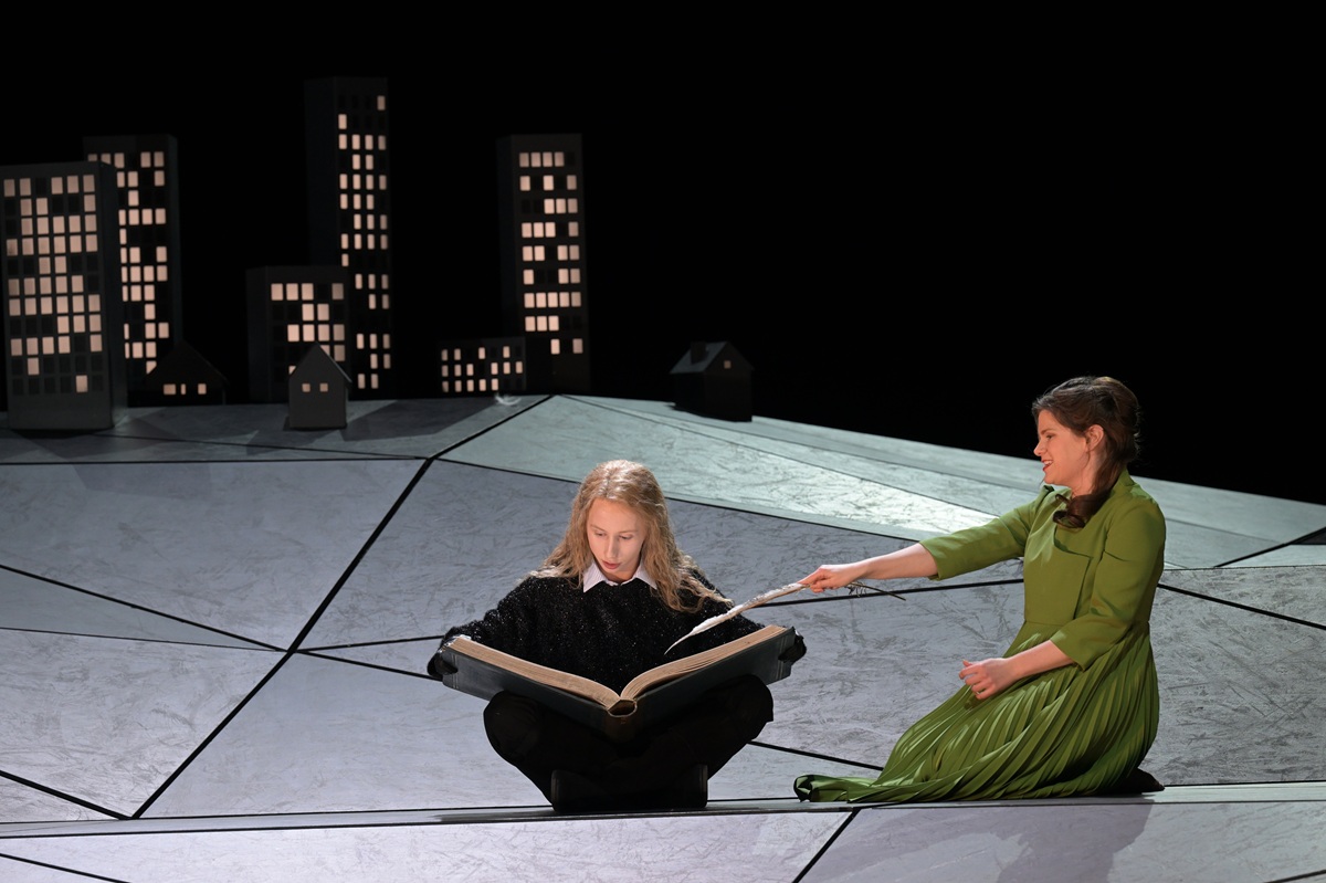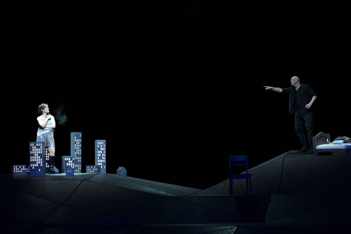 Wie stellt man sich einen Engel vor? Wohl genau so, wie Iurii Iushkevich ihn hier verkörpert: mit langem, blondgelocktem Haar, ein wenig androgyn. Auch sein Countertenor besitzt eine gleichsam überirdische Klarheit und Klangschönheit. Am Rücken offenbaren sich blutverkrustete Stümpfe von Flügeln, die wohl gewaltsam entfernt wurden. Desgleichen sieht man bei den anderen beiden Engeln. Es scheint, dass sie aus dem Himmel in eine experimentelle Welt geworfen wurden. Klaus Grünberg hat dazu ein Bühnenbild ersonnen, von dessen aus schwarzen Dreiecken zusammengesetzter Spielfläche er sagt, sie sehe aus wie eine „nicht fertig gerenderte Computersimulation“. Wenige Kulissenelemente zeigen am hinteren Bühnenrand ein winziges Ensemble von Hochhäusern und ein puppenstubenhaftes Bett. Auch ein Flugzeug zieht gelegentlich am Horizont vorbei.