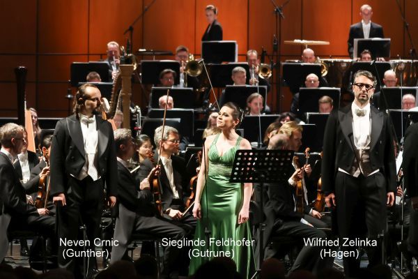 In den Ausschnitten aus der Götterdämmerung konnten sich noch drei Ensemblemitglieder profilieren: Wilfried Zelinka war ein überzeugender Hagen. Mit langem und ruhigem Atem sang er Hagens Wacht und war auch in den Ensembles ausreichend durchschlagskräftig. Man traut ihm nach diesem Abend die gesamte Rolle zu! Neven Crnić war ein profilierter Gunther – auch ihn würde man gerne in der gesamten Rolle erleben.Sieglinde Feldhofer sang als Gutrune ihre Einwürfe mit der gebotenen lyrischen Anmut. Schon zuvor hatte sie im Walkürenritt als Ortlinde mit dramatischen Tönen positiv überrascht. Daniel Kirch war ein kraftvoller und damit überzeugender Siegfried. Bei der lyrischen Phrase Vergäss‘ ich alles gelangte er neuerlich an seine stimmtechnischen Grenzen.Bei ihm dominieren immer – durchaus eindrucksvoll – die dramatischen Fortetöne, die Piano-Phrasen können sich noch verbessern. Großartig zelebrierte Roland Kluttig mit seinen Grazer Philharmonikern Siegfrieds Trauermarsch. Alexandra Petersamer war auch in Brünnhildes Schlussgesang von eindrucksvoller Intensität.