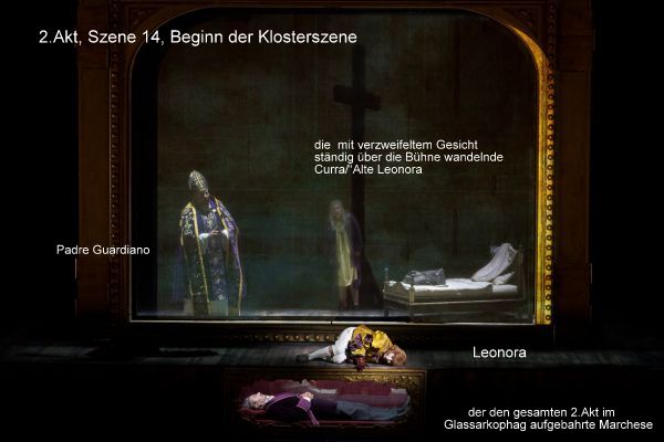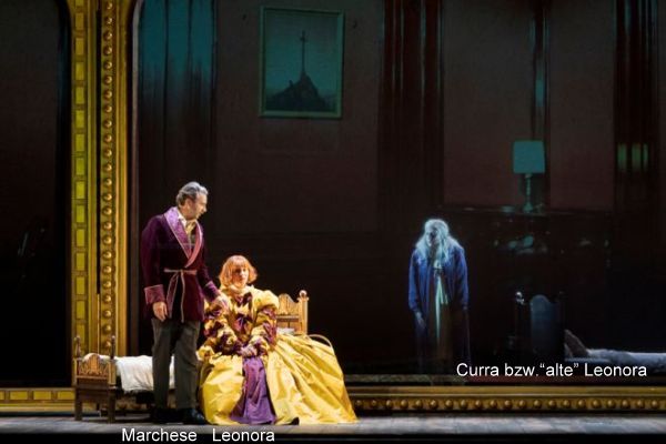Aurelia Florian war eine ganz ausgezeichnete Leonore. Mit ihrem dunklen Sopran beherrschte sie nicht nur die dramatischen Ausbrüche, sondern verstand auch, wunderschöne lyrische Phrasen zu gestalten. Ihr ebenbürtig war Jordan Shanahan . Er war mit seinem markanten Charakter-Bariton eine ideale Verkörperung des nach Blutrache dürstenden Bruders. Seine strahlenden Spitzentöne beeindruckten ebenso wie seine Fähigkeit, große Legatobögen zu spannen.Aldo di Toro war sein Rivale Alvaro, der über absolut sichere metallische Spitzentöne verfügt. Nur im Piano – etwa beim lyrischen Aufstieg Oh, tu che in seno agli angeli in seiner großen Arie zu Beginn des 3.Aktes – hatte er ein wenig Schwierigkeiten, sein heldisches Material zu zentrieren. Man kann sich übrigens sehr gut vorstellen, dass die beiden Herren im Vorjahr in Bern ein großartiges Paar Otello/Jago waren. Timo Riihonen war ein würdiger Pater Guardian. Diesmal fiel mir allerdings auf, dass im Piano und im mezzoforte die Stimme nicht immer so ganz gestützt war und damit etwas flach. Da bestand dann die Gefahr von Intonationstrübungen. Im Forte waren die Spitzentöne makellos. Alle vier Gäste kennt man schon aus verschiedenen Produktionen in Graz, sodass sie gleichsam zum erweiterten Ensemble gehören. Die übrigen Partien waren ausgezeichnet aus dem Ensemble besetzt. Da sei als erste Mareike Jankowski genannt. Sie war zunächst im Opernstudio und ist nun seit 2 Jahren fix im Grazer Ensemble. In dieser Inszenierung war sie als Preziosilla und personifiziertes Schicksal praktisch durchgehend auf der Bühne. Sie verfügt über ein reiches Stimmmaterial und bewältigte die stimmlich exponierte Partie sehr gut. Nur ganz zu Beginn forcierte sie ein wenig – da waren die Spitzentöne (immerhin H!) ein wenig gefährdet. Neven Crnić ließ sich als indisponiert entschuldigen. Dennoch bewältigte er die Partie des Melitone (samt der großen und früher oft gestrichenen Bettlerszene im 4.Akt) ganz ausgezeichnet. Auch die kleinen und kleinsten Partien waren stimmlich exzellent besetzt – vom Marchese des Wilfried Zelinka über den Trabucco von Mario Lerchenberger bis zum chirurgo des Dariusz Perczak und zur szenisch ungemein aufgewerteten Curra von Corina Koller. Spezielles darstellerisches Profil konnten weder die Hauptrollen noch die Nebenrollen entwickeln, zu sehr waren sie in das Regiekonzept gezwängt. Chor & Extrachor der Oper Graz (Leitung: Bernhard Schneider) bewährten sich außerordentlich – man ist geneigt zu sagen: wie immer. Die musikalische Gesamtleitung hatte der erstmals in Graz auftretende junge Italiener Matteo Beltrami. Mit den glänzend disponierten Grazer Philharmonikern vermittelte er authentischen Verdi-Klang mit vielen feinen Details und viel Gespür für die Solisten. Insgesamt war es von der Ouvertüre weg ein sehr breit angelegtes Musizieren, dem ich manchmal mehr Vorwärtsdrängen gewünscht hätte.