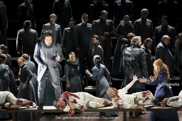 Nach den kammerspielartigen ersten Szenen bildet das Autodafé am Ende des zweiten Akts einen geradezu verstörend grellen Kontrapunkt. Das Orchester trumpft in vollem Glanz auf, Chor und Extrachor der Oper (Leitung: Bernhard Schneider) bieten präzise Stimmfülle – Oksana Lyniv hält alles in großartiger Balance. Es tönt prächtig und nie vordergründig grell. Erschreckend grell wird es allerdings optisch, wenn die von der Inquisition zu Tode Verurteilten nicht wie gewohnt in Kutten von den Mönchen zur Hinrichtung geführt, sondern auf einer endlosen Bank blutig-gefolterte Leiber hereingeschoben werden und am Ende auch die flandrischen Deputierten zu diesen Folteropfern gehören, die ihre Hände dem König entgegenstrecken. Der 36-jährige hünenhafte finnische Bassist Timo Riihonen ist der stimmlich und darstellerisch dominierende Mittelpunkt in dieser blutrünstigen Szene, die von der Regie geradezu minutiös choreographiert ist. Dazu ein Beispiel: als der König einen blutigen Arm der Opfer berührt, zucken die Chormassen erschreckt zusammen. Konsequent ist auch, dass die Stimme von oben nicht unsichtbar bleibt, sondern dass Tetiana Myius als letzte auf der Blutopferbank berührend ihr Solo singt. Ich empfand die krassen Bilder als den Wendepunkt des gesamten Abends. Ab dem 3.Akt durchbrechen die menschlichen Emotionen endgültig die zwanghaften Konventionen.