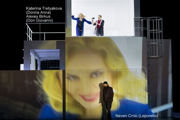 Es gab in den letzten Jahren viele Opernproduktionen in Graz, bei denen ich Einwände gegen die szenische Umsetzung hatte. Da wurde das eigentlich immer durch sehr gute musikalische Leistungen „ausgeglichen“. Diesmal war das für mich leider nicht so! Das lag wohl zunächst an der musikalischen Leitung von Andrea Sanguineti Er wählte von Beginn an straffe, ja drängende Tempi. Aber das allein war nicht entscheidend – ich hatte den Eindruck, dass er sich in seiner Interpretation von der unruhigen Regie geradezu getrieben fühlte, die durch permanenten Einsatz der Drehbühne und durch die wechselnden, überlagernden Video-Projektionen keinerlei Ruhepunkte zuließ. Da wurde speziell im 1.Akt in permanenter Einheitslautstärke musiziert. Sanguineti begleitete alle Rezitative selbst am Hammerflügel – oft mit ein wenig manieriert wirkenden Zitaten (Figaro, Lohengrin, Türkischer Marsch und anderes). Auch dadurch gab es für mich sehr oft einen überstürzt-abrupten Übergang von den Rezitativen zum Orchester. Damit wurde auch auf die Gesangssolisten ständiger Druck ausgeübt, die gar nicht dazu kamen, Phrasen zu modellieren und den Ausdruck zu variieren. Es wurde einfach ständig in einem Einheitsforte gesungen. Das ist vor allem deshalb besonders zu bedauern, weil die Solisten allesamt über reiche und für ihre Partien geeignete Stimmen verfügen. Alexey Birkus als Don Giovanni ist ein schöntimbrierter, echter Basso cantante, Neven Crnić ein robuster Leporello und Katerina Tretyakova eine höhensichere, dramatische Donna Anna. Die spanische Mezzosopranistin Anna Brull bewältigte die Elvira eindrucksvoll und Pavel Petrov war als Don Ottavio ein italienischer Belcantist. Dariusz Perczak war ein souveräner Masetto – und nur die stimmlichen Leistungen von Opernstudio-Mitglied Eva-Maria Schmid als Zerlina und von Dmitrii Lebamba als (vor allem aus dem Off recht tremolierend klingender) Komtur sind noch ausbaubar. Sie allen waren zu einem recht undifferenzierten Singen angehalten. Man war im 2. Akt froh, dass zumindest an drei Stellen Mozart zu seinem Recht kam: in Ottavios Arie Il mio tesoro und in den beiden großen Szenen von Donna Elvira und von Donna Anna erlebte man erfreulich gestalteten Mozartgesang.
