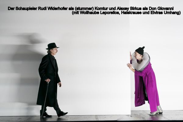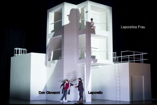 Die Regisseurin äußert sich im Programmheft: Unser Raum ist eine Festung, ein Schloss, wirkt unentrinnbar und ist tatsächlich auch ein modernes Labyrinth, aus welchem keine der Figuren entkommen wird. Die Bühnenbildnerin hatte dazu gemeint, sie sei von den Gated Communities inspiriert worden. Gerne bekenne ich, dass ich keine Ahnung hatte, was damit gemeint sei – aber dank Wikipedia ist das alles aufklärbar: Eine Gated Community beschreibt einen geschlossenen Wohnkomplex mit verschiedenen Arten von Zugangsbeschränkungen. Natürlich ist auch diesmal bereits die Ouvertüre bebildert – die Gated Community rotiert ständig, die Figuren des Stücks sind isoliert in ihren „Einzelzellen“, offenbar auf sich selbst fixiert. Und es ist auch eine zusätzliche Figur eingeführt: Leporellos Frau, eine zarte Mädchenfigur, die ständig ein Baby mit sich trägt und sorgenvoll über die Bühne schreitet. Die Regisseurin begründet die Einführung dieser Figur damit, dass Leporello laut Text verheiratet sei – da stützt sie sich wohl auf das Rezitativ gegen Ende des 2. Aktes – Leporello: Ma se fosse costei stata mia moglie? Abgesehen davon, dass Lorenzo da Ponte hier den congiutivo trapassato einsetzt – also nur von einer theoretischen Möglichkeit gesprochen wird – trägt diese Kunstfigur nichts zum Handlungsgeschehen bei und die ratlose Frage eines Besuchers am Ende der Vorstellung an der Garderobe ist verständlich: Und was ist mit Leporellos Kind am Ende geschehen? Der Komtur erscheint nur in der 1.Szene persönlich. Im 2. Akt hört man seine Stimme nur über (verzerrenden) Lautsprecher. Dafür geistert den übrigen Abend sein Doppelgänger über die Bühne – eine zerbrechliche, an den großen Arik Brauer gemahnende Kunstfigur: Nicht zu Unrecht sprach ein anderer Besucher von einem szenischen Desaster der Komturszene.