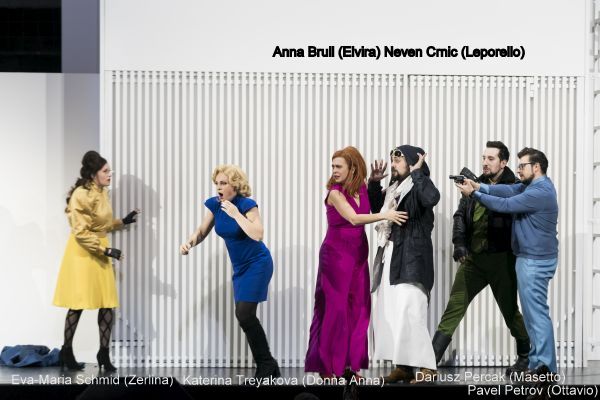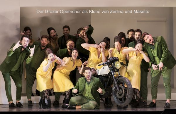 Die eindimensionale musikalische Gestaltung liegt natürlich auch – und wohl vor allem an der Regie, die ausdrücklich die zu Mozarts Zeiten übliche gesellschaftliche Trennung zwischen Adel, Bürgertum und Bauern negiert. Alles spielt sich in einem Einheitsbrei moderner Spaßgesellschaft ab, alle Figuren sind gleichgeschaltet – entsprechend modern können sie sich um ihre libidinösen Bedürfnisse kümmern und sind dabei alle existenziell-gefährdet unterwegs – so die Regisseurin im Programmheft. Kein Wunder, wenn bei einem derartigen Konzept die musikalischen Subtilitäten der Mozart-Partitur untergehen! So empfindungslos und sich permanent bloß um Selbstbespiegelung mit Selfies und – um ihre libidinösen Bedürfnisse kümmernd – hat man die Mozart-Figuren selten erlebt. Ihre Zwiespältigkeit, Doppelbödigkeit und auch Rätselhaftigkeit waren nicht zu erleben – schade! Die stimmlich ordentliche Leistung des Chors (Einstudierung: Georgi Mladenov) soll nicht unerwähnt bleiben. Szenisch waren seine Aktionen – als Klone von Zerlina und Masetto – eher peinlich – ebenso wie das zwanghafte Mittanzen der (sauber musizierenden!) Bühnenmusik.