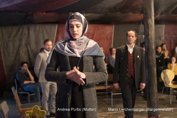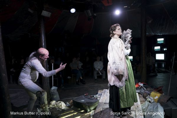 Und allein wegen Butters maßstabsetzender Interpretation der effektvollen Titelfigur lohnt es sich unbedingt, diese Aufführung zu besuchen. Als schmierig-herabgekommener Gaukler zieht er mit exzellenter Wortdeutlichkeit, souveräner Stimmführung und intensivem Spiel alle in seinen Bann – die handelnden Personen ebenso wie das Publikum, das immer wieder in seine Aktionen einbezogen wird. Der Regisseur Christian Thausing verlegte gemeinsam mit dem an der Kunstuniversität Graz ausgebildeten Bühnen- und Kostümbildner Christoph Gehre das Stück in ein schäbiges Provinz-Zirkuszelt der österreichischen Gegenwart – in einen Unraum, der den momentanen Zustand unserer Gesellschaft und den Kern des Stückes widerspiegelt (Zitat aus dem Programmheft). Das Publikum sitzt im Kreis um ein verdreckt-schäbiges Podium – verteilt im Publikum sind auch die Figuren des Stücks, die Jungen aus dem Dorf und viele Statisten. Der Bürgermeister im Trachtenanzug, Signora Angiolieri im Dirndl und die Mutter als Außenseiterin mit Hidschab-Kopftuch – es ist sofort klar: es geht nicht mehr um den italienischen Faschismus der Novelle, sondern um bedrohliche Entwicklungen in unserer heutigen Gesellschaft. Das Konzept kann sich da mit gutem Recht auf ein Wort von Thomas Mann berufen, wonach die Novelle entschieden einen moralisch-politischen Sinn hat.
