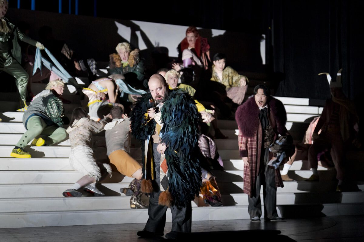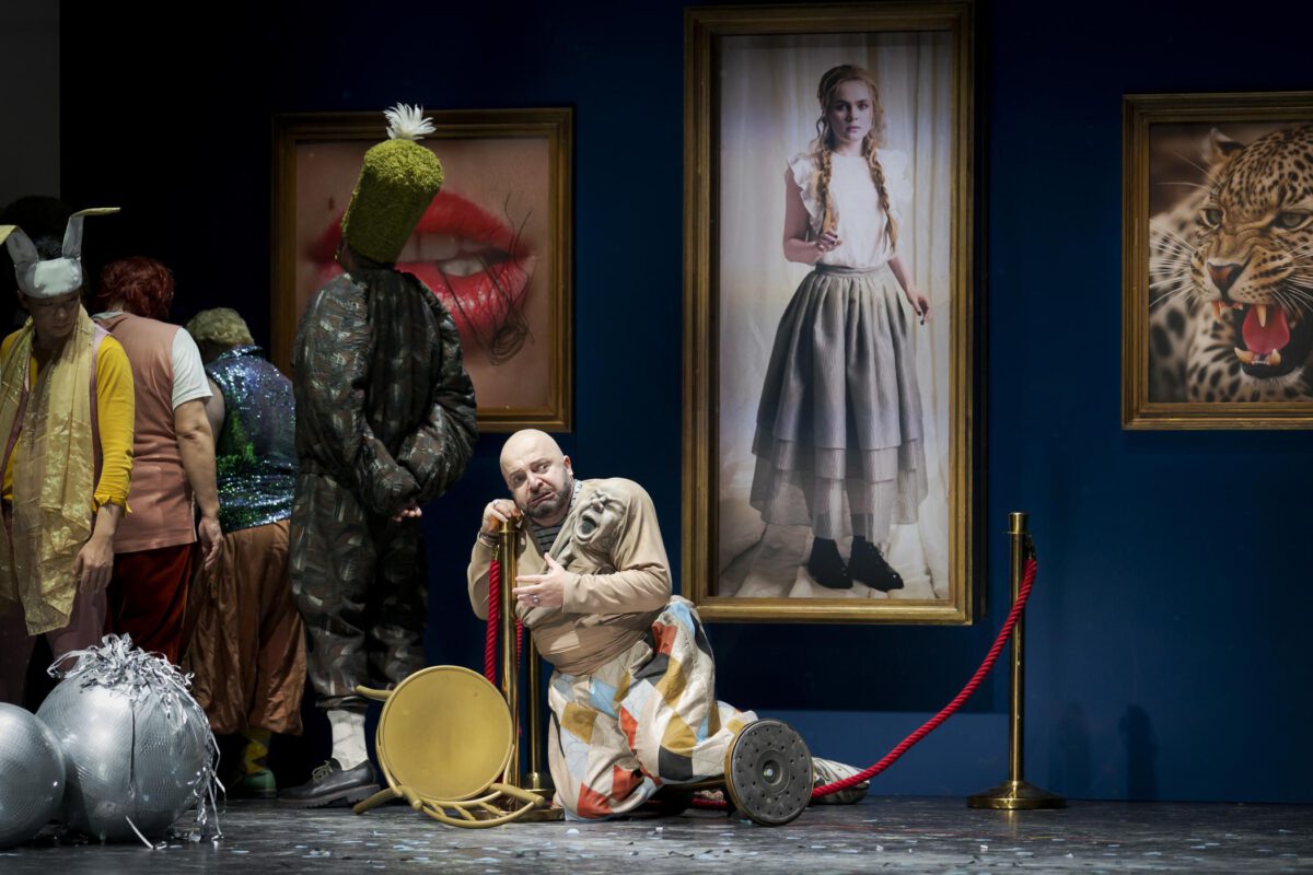 Der „eigentliche“ Rigoletto, der in dieser Inszenierung letztlich so nicht existiert, ist als Narr am Hofe des Herzogs von Mantua ebenso Zielscheibe des Spottes der Hofgesellschaft, wie er umgekehrt spöttisch Kritik an der unmoralischen, unterdrückenden Lebensgestaltung des Herzogs übt. An dessen Hof werden üppige Feiern, eher Orgien, gefeiert, in denen die Frauen als reine Objekte behandelt und zur Bedürfnisbefriedigung der Herren, von Katharina Tasch in vom Barock inspirierten exzentrischen Kostümen eingekleidet, eingesetzt werden. Ob es zur Darstellung der dort herrschenden Amoralität so plakative Szenen, die für die mit Bananen hantierenden Frauen übermäßig herabwürdigend wirken, gebraucht hätte, ist fraglich. Die Problematik des sehr unedlen Hofzeremoniells wäre auch mit Andeutungen und feinfühligerer Symbolik deutlich geworden. Dass aus dem selbstsüchtigen, die jeweilige Person nicht respektierenden Handeln des Herzogs Konflikte entstehen müssen, sobald ein Vater zumindest die Ehre seiner Tochter vor der Korrumpierung, besser gesagt: dem Missbrauch, schützen will, ist vorprogrammiert. Dass Rigoletto den ausgesprochenen Fluch rein auf sich bezieht, davon besessen und immer mehr in den Wahnsinn gezogen wird, ist jedoch seiner gestörten, höchst unsicheren Persönlichkeit zuzuschreiben, die darin gewissermaßen auch eine Entäußerung der eigenen Verantwortung sieht. Ähnlich wie Macbeth klammert er sich an eine schicksalshafte Macht, die Drohung des Fluches scheint seine geplante Rache als beinahe notwendige Reaktion auf das ihm widerfahrene Unrecht zu rechtfertigen. Dabei übersieht er jedoch, dass er selbst es ist, der Unrecht übt, verantwortlich ist für Unterdrückung und die immer tiefere Verstrickung in das Verderben, das ihn letztlich selbst treffen wird. Durch die Umdeutung Sparafuciles zu einer der Persönlichkeiten Rigolettos greift selbst die versuchte Abwälzung der Verantwortung für den Mord nicht mehr.