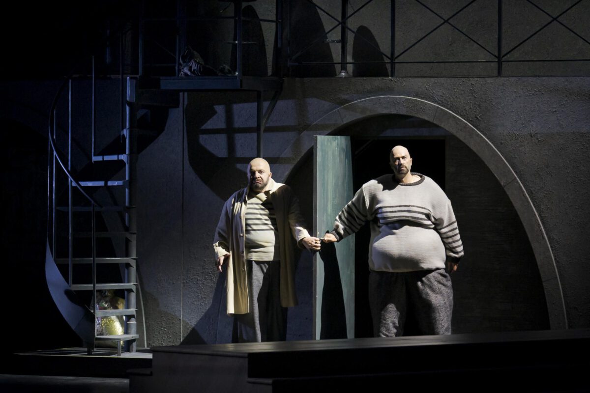 Das Glück scheint perfekt zu sein: In enger Umarmung hält Rigoletto seine Frau, gemeinsam betrachten sie liebevoll die neu geborene Tochter im Kinderwagen. Doch die Frau fühlt sich eingeengt, erstickt in der Umklammerung ihres Mannes, und reißt sich los. Rigoletto ist verzweifelt und kann den Verlust seiner Liebe nicht verkraften, es ist der Anfang seiner tief gestörten Persönlichkeit, die sich aufspaltet, verschiedene Personae annimmt und selbst die positiven Welten seiner Lebensrealität durch sein obsessives Bedürfnis nach Kontrolle und Gestaltung rein nach seinen Vorstellungen zerstört und unterdrückt. Mit dieser während des Preludio gezeigten Szene setzt Ute M. Engelhardt die Grundlage ihrer Interpretation. Dieser Anfang des Wahnsinns, letztlich der Persönlichkeitsstörung Rigolettos bildet den entscheidenden Einschnitt, die Ursünde – oder vielmehr die Vertreibung aus dem Paradies – in seinem Leben, die fortan all sein Handeln und sämtliche Beziehungen vergiften wird. Ob die Frau, wie im Libretto vorgesehen, stirbt oder sich aus Rigolettos egozentrischer, einengender Liebe befreit, spielt keine Rolle, entscheidend ist der Moment des Verlassenwerdens und die folgende Einsamkeit, die wesentlich auch von der Erfahrung, nicht alles im Leben nach den eigenen Wünschen gestalten zu können, geprägt ist. Engelhardt ergänzt diesen Wendepunkt im Leben Rigolettos durch eine psychologisch tiefgreifende und im weiteren Verlauf des Stücks sich als äußerst überzeugend erweisende Deutung: Nach der Flucht seiner Frau erscheint Sparafucile, der Auftragsmörder, und legt Rigoletto den Buckel um, der keine reine Deformierung des Körpers ist, sondern vielmehr eine der Seele, ausgedrückt durch eine von wutvollem Schrei verzerrte Maske auf seiner Schulter. Das Äußere Sparafuciles ist jenem Rigolettos angeglichen, wodurch erkenntlich wird, dass dieser die abgespaltete Persönlichkeit des Hofnarren verkörpert, seine dunkle Seite, die von dem Wunsch nach Rache verzehrt wird. Diese Vereinigung zweier Figuren, die mit einer Aufteilung der verschiedenen gestörten Wesenszüge und Lebenswelten einhergeht, wird im Laufe der Inszenierung geschickt fortgesetzt, immer wieder zeigt sich im Aufeinandertreffen von Rigoletto und Sparafucile als seiner dunklen, gefährlichen Seite das Ringen der Person mit sich selbst, an dem sie jedoch fortlaufend scheitert. Selten gehen solche Eingriffe in das Werk so schlüssig auf wie in dieser Inszenierung, in der dadurch psychologisch differenziert und auf eindrückliche Weise verstörend ein Psychogramm Rigolettos gezeichnet wird. Die Grenzen zwischen den Persönlichkeiten wie auch zwischen der Realität und Rigolettos eigener vom Wahn verzerrten Wahrnehmung verschwimmen. Das Ineinandergreifen seiner unterschiedlichen Seiten kulminiert in der durch diese Interpretation unheimlichen Textstelle: „Wir sind gleich! Ich habe die Zunge, er den Dolch.“