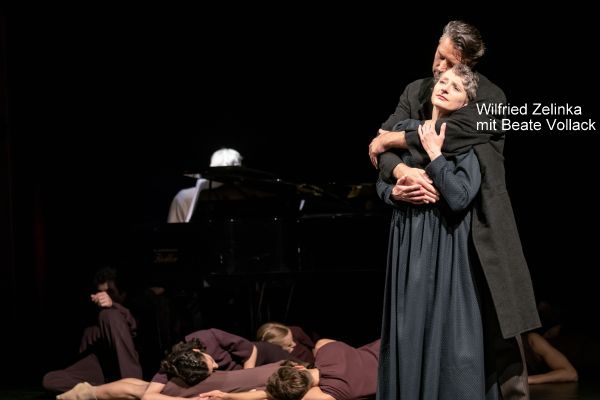 Das Programmheft lässt offen, ob sie das Weibliche an sich oder etwa eine konkrete Frau aus Schuberts Leben verkörpert. Da denkt man unwillkürlich an Gräfin Karoline Esterházy de Galántha , die Schubert bis zu seinem Lebensende sehr vereehrt hat. In einem Beitrag liest man u.a.: Während dieser Zeit komponiert er einige Stücke für Klavier zu vier Händen. Auffällig an diesen Werken ist, dass die Arme der Spieler sich häufig kreuzen. Vermutlich steckt dahinter der Wunsch, die Hand der jungen Gräfin, zu der Schubert eine heftige Zuneigung gefasst hatte, zu berühren. So widmete er ihr u.a. den Schwanengesang. An diese Überlieferung musste ich denken, als im Laufe des Abends mehrfach Beate Vollack und Wilfried Zelinka mit geöffneten Armen aufeinander zugingen, sich aber nicht die Hände reichten, sondern berührungslos und ohne Blickkontakt aneinander vorbeischritten.