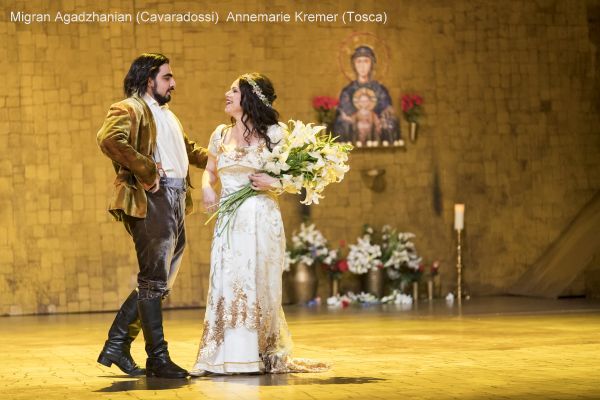 In der Wiederaufnahme der letzten Grazer Neuproduktion von 2014 sind alle drei Hauptpartien neu besetzt und Opernenthusiasten können sich auf drei Künstler freuen, die allesamt zum ersten Mal auf der Grazer Opernbühne zu erleben sind: die niederländische Sopranistin Annemarie Kremer, die in Österreich zuletzt in Linz als Isolde beeindruckt hat. Aus Armenien stammt Tenor Migran Agadzhanyan, der beim letztjährigen „Operalia“-Wettbewerb den zweiten Preis ersungen hat und dessen Karriere spannende Engagements wie Maurizio („Adriana Lecouvreur“) beim Festival in Baden-Baden, Don Carlo, Edgardo („Lucia di Lammermoor“) und Rodolfo („La Bohème“) in Sankt Petersburg am Mariinski-Theater, Prinz Juri („Die Zauberin“) in Lyon, Pinkerton („Madame Butterfly“) in Berlin und Stockholm und demnächst Don José („Carmen“) in Macerata beinhaltet. Als Scarpia ist der Bariton Jordan Shanahan zu Gast. Er stammt aus Hawaii, hat Posaune, Komposition und Gesang studiert und verfügt über ein Repertoire, das mittlerweile mehr als sechzig Partien umfasst, wie beispielsweise Don Giovanni, Rigoletto, Escamillo, Eugen Onegin, Telramund, und die Titelpartie in Wagners „Der fliegende Holländer“. Regisseur Alexander Schulin und Bühnenbildner Alfred Peter übertragen die genau definierten Schauplätze in eine optische Umsetzung, die die goldene Pracht des sakralen Raums ebenso zeigt wie die klaustrophobische Enge des Arbeitszimmers des Polizeichefs. In sämtlichen Hauptpartien neu besetzt, kehrt „Tosca“ unter der Leitung von Chefdirigentin Oksana Lyniv zurück auf den Spielplan der Oper Graz.