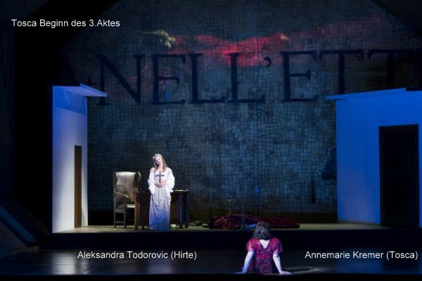 Und zuletzt muss noch ein Mann ausdrücklich vor den Vorhang geholt werden, der sich am Ende mit den Ausführenden nicht dem Publikum zeigte: Christian Thausing. Er arbeitet an der Oper Graz seit vielen Jahren als Regieassistent, wird fallweise mit kleineren selbstständigen Regieaufgaben betraut und hatte diesmal die „Szenische Einstudierung“ des Abends übernommen – „nach einer Inszenierung von Alexander Schulin“. Er hat die verkrampft originell sein wollende Inszenierung (Zitat aus einer Printmedium-Kritik der ursprünglichen Premiere des Jahres 2014) von den ärgsten Peinlichkeiten befreit und im Rahmen des Möglichen eine plausible, handwerklich saubere Fassung erstellt. Einige Punkte der ursprünglichen Inszenierung, die nun weggefallen sind, seien dankbar und erleichtert aufgezählt: der Mesner leidet nicht mehr unter permanenten spastischen Zuckungen; im 3. Akt treten die Akteure nicht mehr rückwärtsgehend auf; die Videoprojektion mit Toscas halbstündigem Todessprung (Zitat aus einer Premierenkritik) ist zwar erhalten, aber nur mehr sehr blass und andeutend sichtbar; Tosca springt am Ende nicht mehr von Scarpias Schreibtisch ins Nichts, sondern steht mit erhobenen Armen in der Bühnenmitte – gleichsam ein verklärter Liebestod. Christian Thausing ist das Kunststück gelungen, das Grundkonzept des Regisseurs zu erhalten, wonach der 3.Akt ein surreales Traumgeschehen ist – und dies handwerklich wesentlich überzeugender zu gestalten. Das ist die Leistung eines Praktikers im Opernalltag, die es verdient, gebührend gewürdigt zu werden. Nun ist das – zumindest ein wenig – repariert, was die renommierte österreichische Tageszeitung Die Presse in ihrer Kritik vom Oktober 2014 abschließend so beschrieben hatte: Keine Engelsburg, kein römisches Morgengrauen, nichts, Kirche und Scarpia-Zimmer verschachtelten sich zum Schluss-Tableau ineinander. Das stört zwar nicht empfindlich, bringt aber weder neue Facetten noch eine Verdeutlichung der Handlung. Schade.